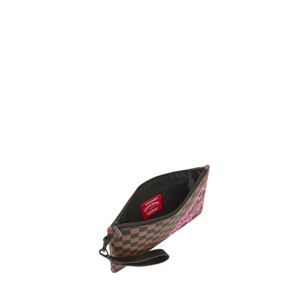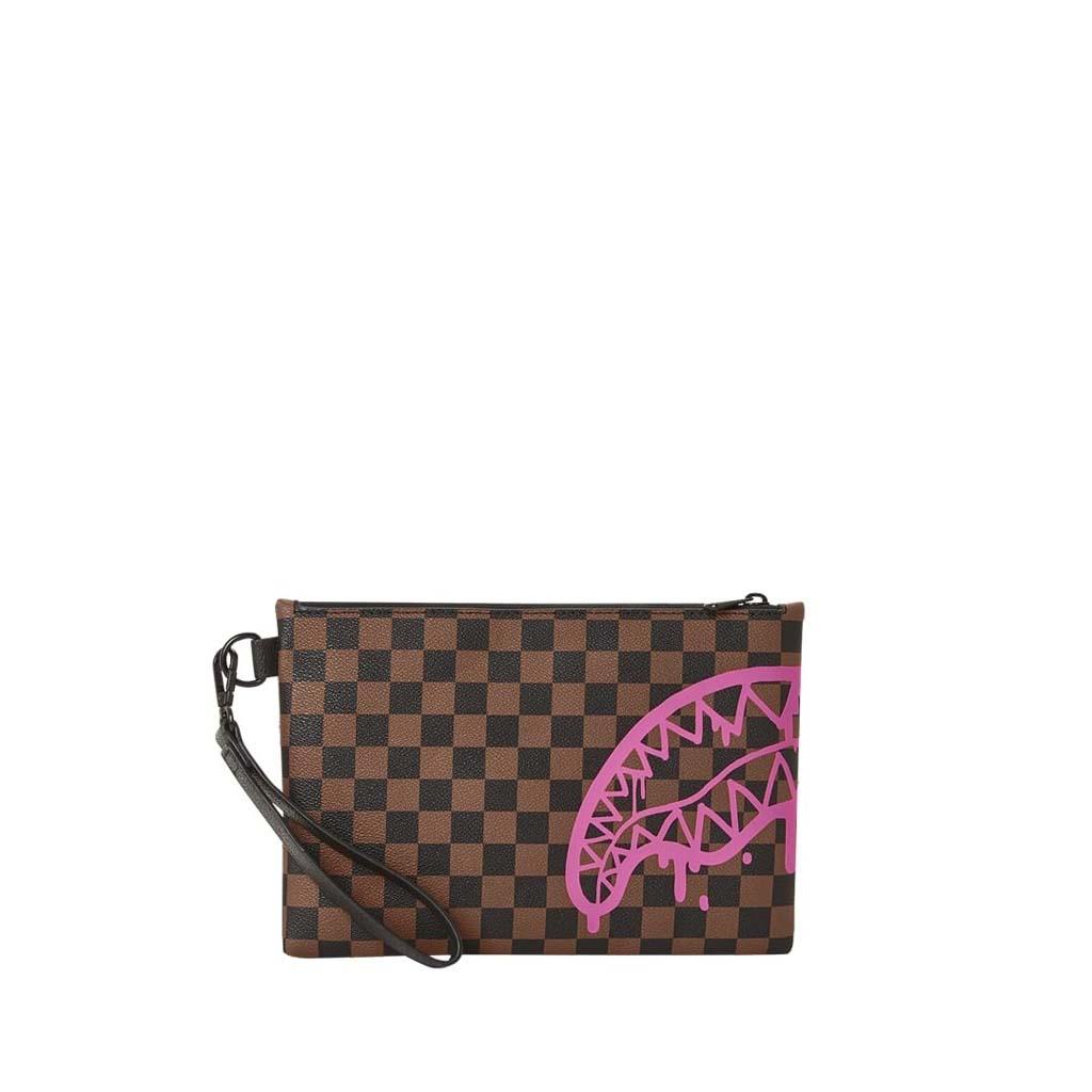 La pochette Sprayground presenta il suo iconico motivo con i denti di squalo in stile graffito su un’ecopelle checkerboard nera e marrone. E’ dotata di un cinturino da polso rimovibile, maniglia sul pannello frontale, chiusura a zip, tasca segreta profonda nascosta nella cucitura laterale.
