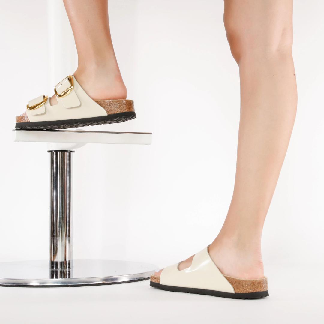 Le Birkenstock Arizona Big Buckle sono l’evoluzione di un vero classico che entusiasma il mondo della moda con il suo design essenziale. Presenta due fibbie ad ardiglione grandi ed eleganti, un bel particolare che spicca su questi sandali molto sobri. La tomaia è composta da pelle beige lucida particolarmente spessa e resistente, lavorata a cuciture aperte.