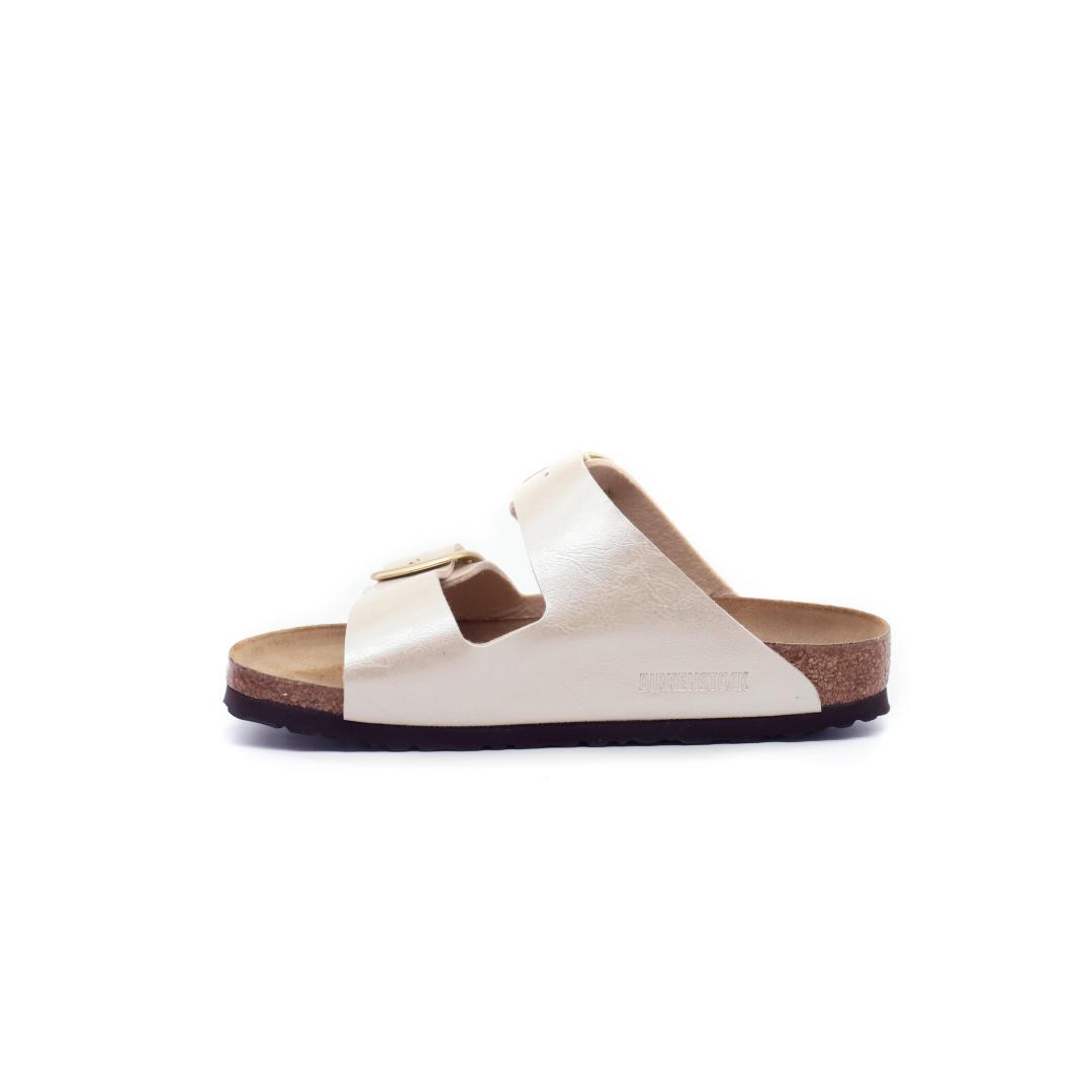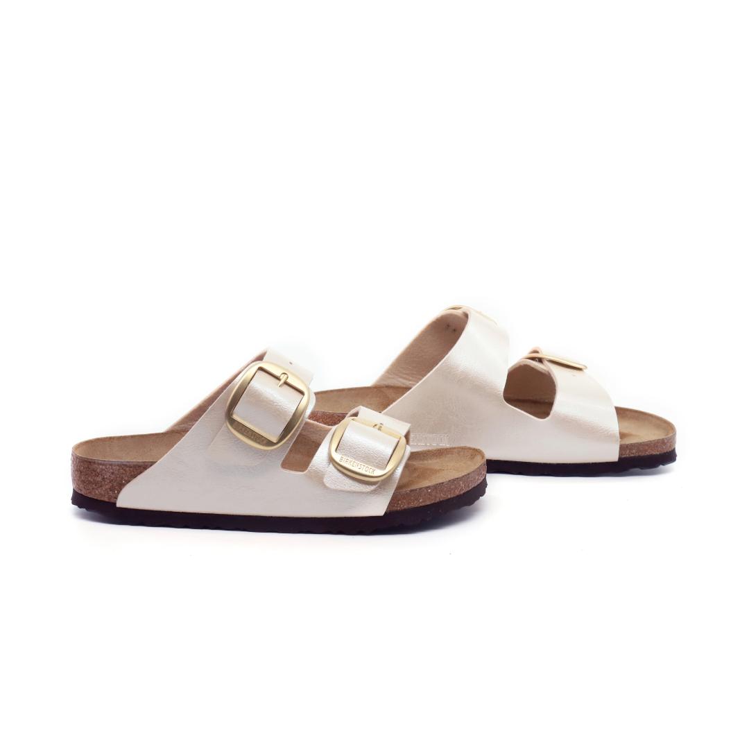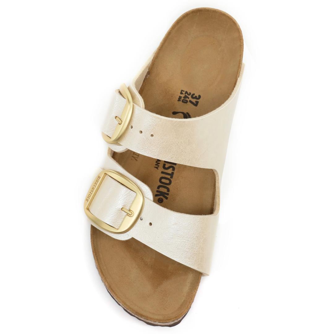 Le Birkenstock Arizona Big Buckle sono l’evoluzione di un vero classico che entusiasma il mondo della moda con il suo design essenziale. Presenta due fibbie ad ardiglione grandi ed eleganti, un bel particolare che spicca su questi sandali molto sobri. I plantari anatomici le rendono una scarpa cult dal confort unico. La tomaia perla è realizzata in materiale Birko-Flor dermoaffine e resistente.