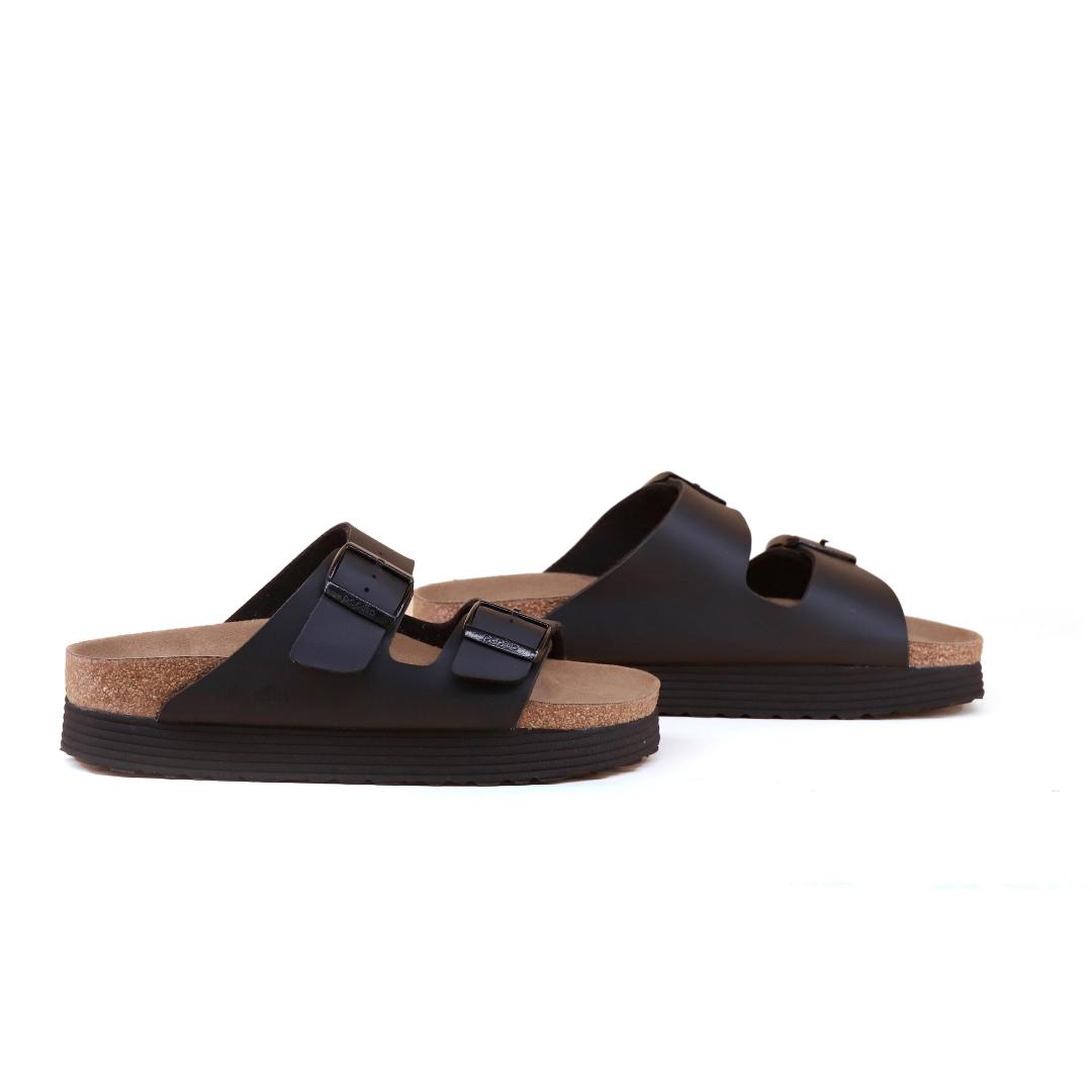 Le Birkenstock Arizona Platforms Bs sono l’evoluzione del grande classico del brand tedesco leader mondiale, della linea Vegan Papillo. La tomaia nera, è realizzata in materiale Birko-Flor dermoaffine e resistente, è regolabile individualmente con due cinturini. I plantari anatomici sono caratterizzati da un lieve platform.