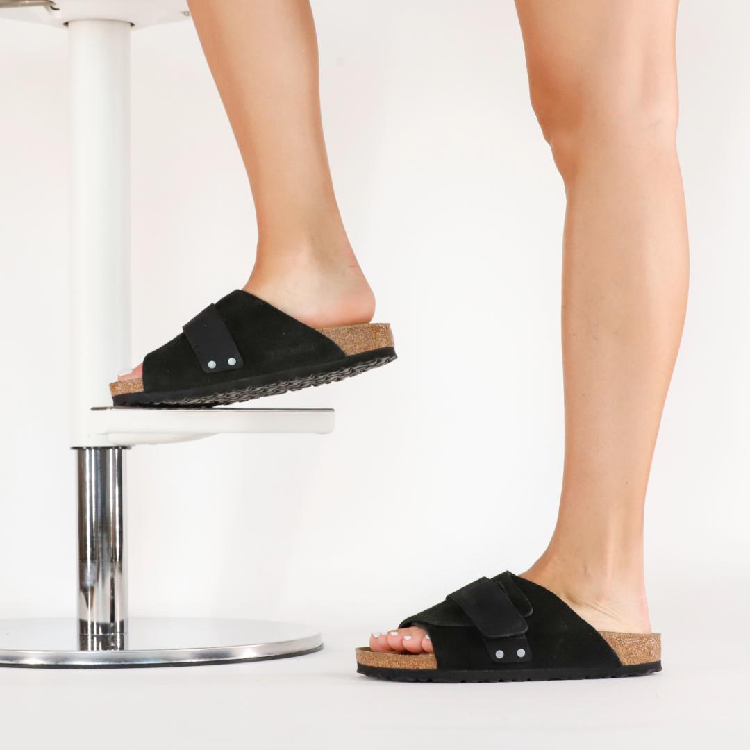 Le BIRKENSTOCK Kyoto sono ispirate dal classico Zürich e sono caratterizzate dalla chiusura regolabile individualmente che garantisce stabilità ottimale ed è completata da dei rivetti decorativi. La tomaia è composta da pelle scamosciata nera particolarmente morbida, che aderisce al piede come una seconda pelle.