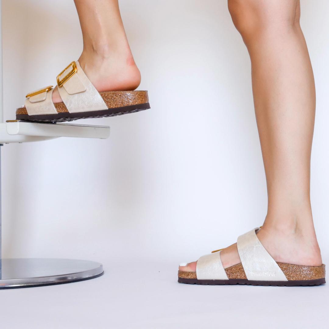Le Birkenstock Sydney Cushion Buckle sono l’ultima evoluzione di un vero classico che entusiasma il mondo della moda con il suo design essenziale. Presenta due fibbie spesse e brillanti, leggermente arrotondate, per un tocco di stile unico. I plantari anatomici le rendono una scarpa cult dal confort unico. La tomaia color perla è realizzata in materiale Birko-Flor dermoaffine e resistente.