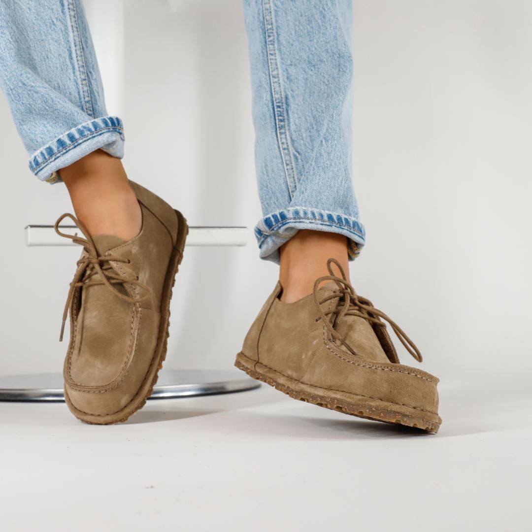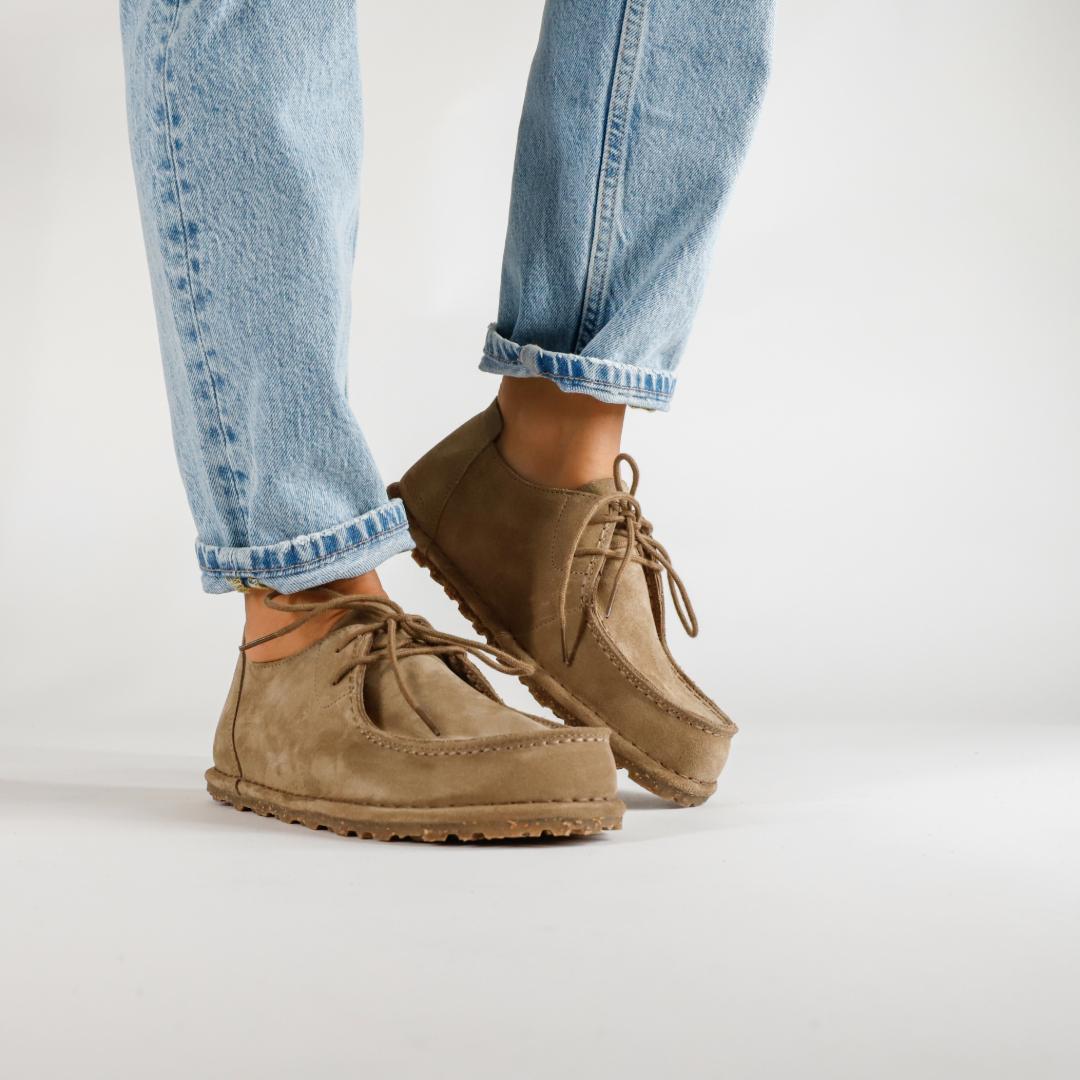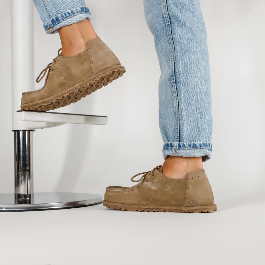 Le Birkenstock Utti sono la nuova scarpa in stile mocassino dal design senza tempo. Sono realizzate in camoscio beige, e caratterizzate da un’appariscente cucitura sulla punta. La linguetta sul tallone e il plantare brevettato Deep Blue, anatomico ed estraibile, aumentano la comodità. La suola è in gomma di caucciù naturale, con elementi in sughero.
