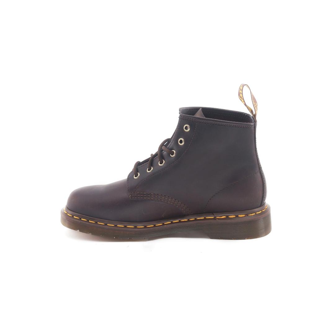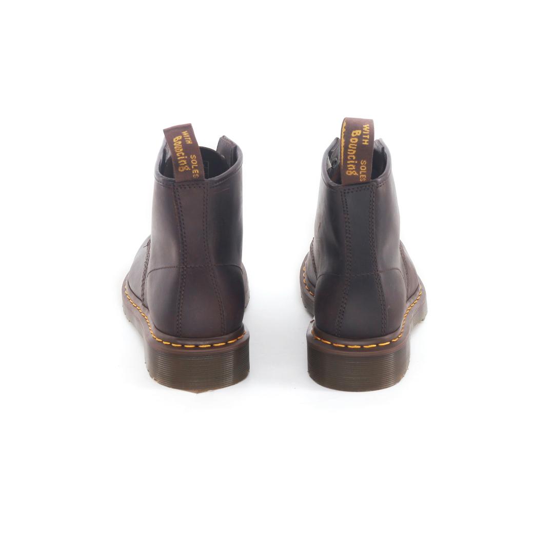 Le Dr. Martens 101 Crazy Horse sono la nuova versione che arriva poco sotto la caviglia, mantenendo comunque tutte le caratteristiche uniche dei più conosciuti Docs 1460. Sono realizzate in pelle marrone ingrassata con 6 fori. La suola brevettata con cuscinetto d’aria è dotata dell’iconica cucitura gialla lungo la suola, oltre all’inconfondibile fettuccia con marchio AirWair sul tallone.