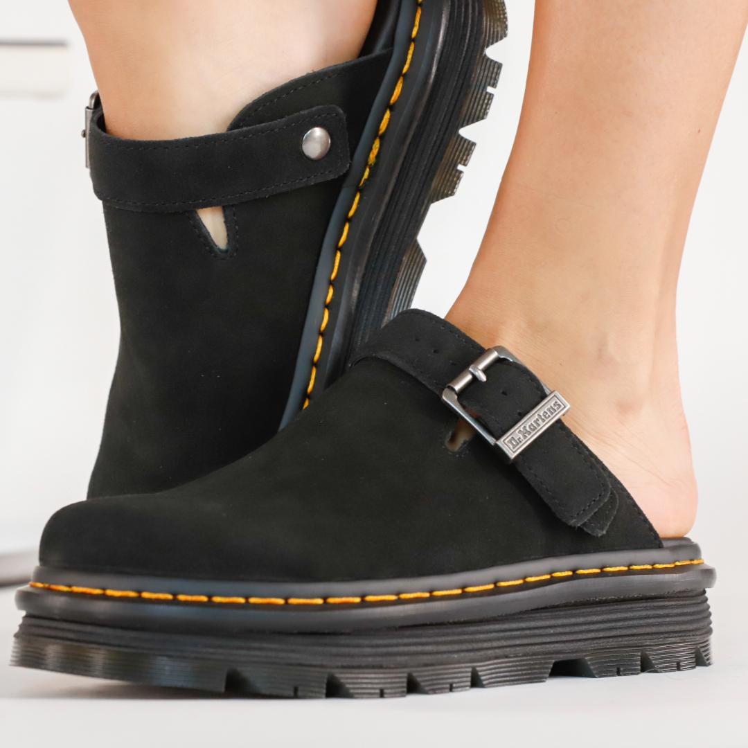 Le Dr. Martens ZebZag sono le nuove mules dal carattere forte e moderno. Sono realizzate in morbido camoscio nero, con la suola a cuscinetto che fonde la leggerezza EVA con la robustezza PVC. Il cinturino regolabile offre una calzata perfetta, e le caratteristiche cuciture gialle garantiscono una struttura rinforzata e duratura.