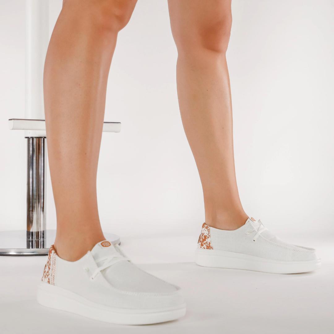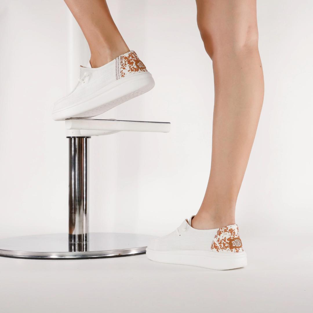I mocassini HEYDUDE Wendy Rise racchiudono il massimo comfort in un unico prodotto. La tomaia è realizzata in tessuto bianco, con il tallone marrone è rivestito in misto tela. Il plantare in morbido sughero e il lieve platform contribuiscono ad alleggerire il passo per un comodità e una leggerezza unica.