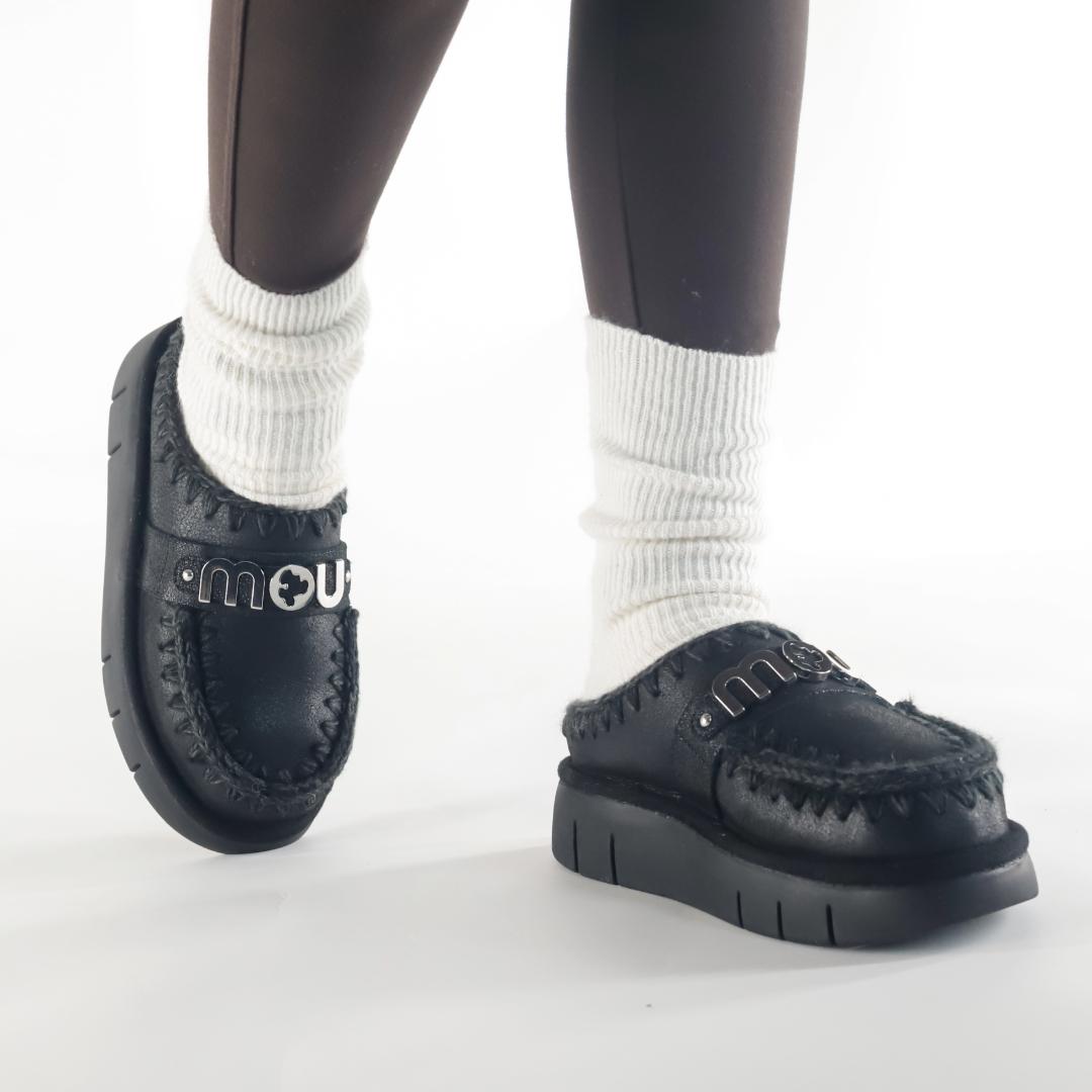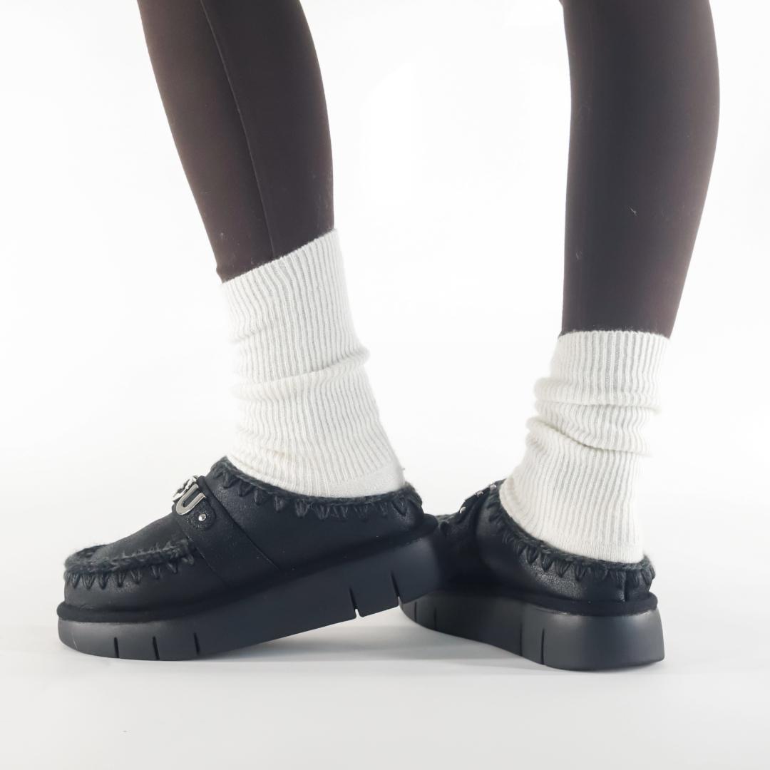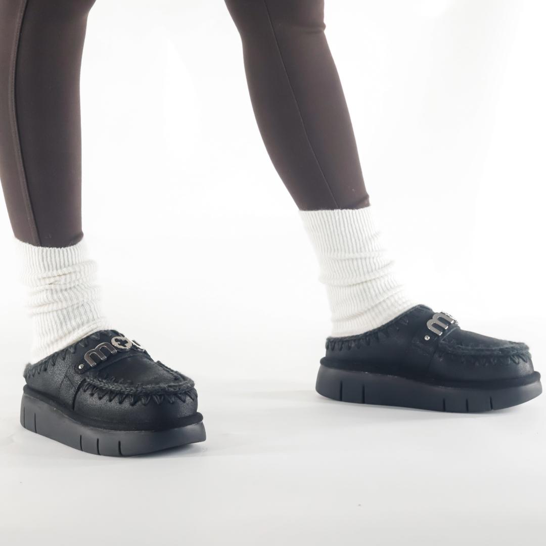 Le nuove Bounce Clog sono le slippers dal design raffinato e dal comfort unico. Sono realizzate a mano in vera pelle di montone double-face nera, con il logo in metallo e l’iconica maxi cucitura a contrasto. Il plantare in morbido e caldo montone avvolge il piede, mentre la suola leggera in EVA e gomma assicura stabilità e comodità in ogni passo.