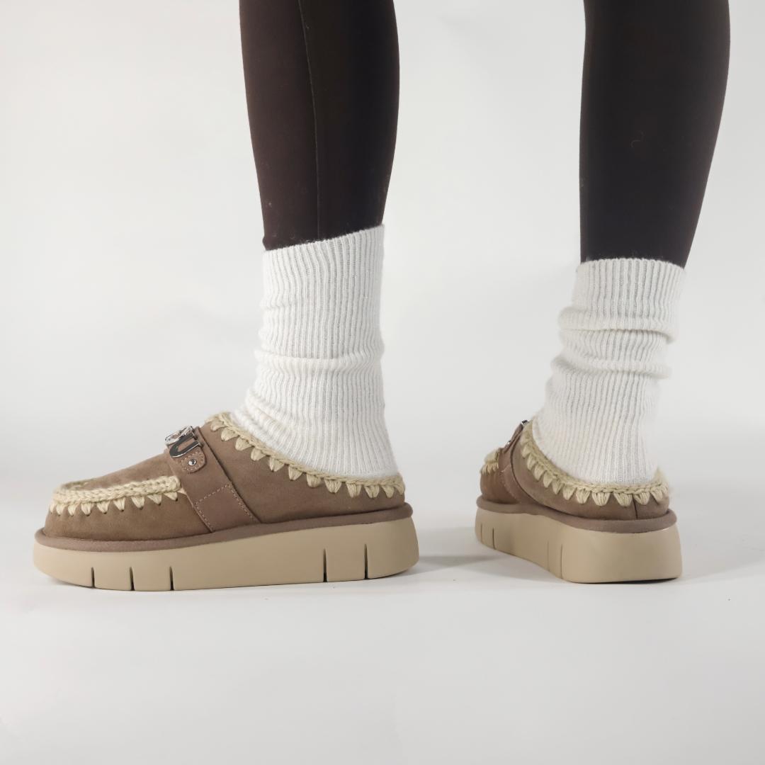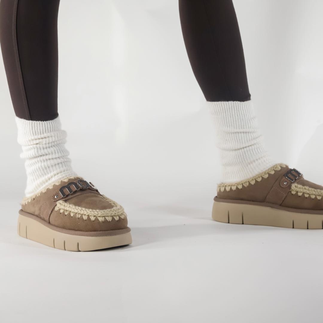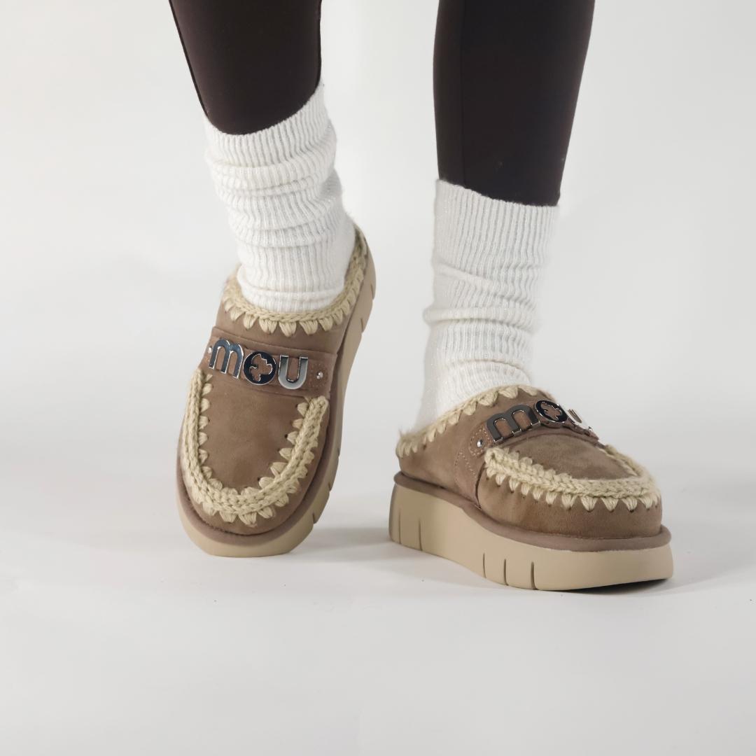 Le nuove Bounce Clog sono le slippers dal design raffinato e dal comfort unico. Sono realizzate a mano in vera pelle di montone double-face taupe, con il logo in metallo e l’iconica maxi cucitura a contrasto. Il plantare in morbido e caldo montone avvolge il piede, mentre la suola leggera in EVA e gomma assicura stabilità e comodità in ogni passo.