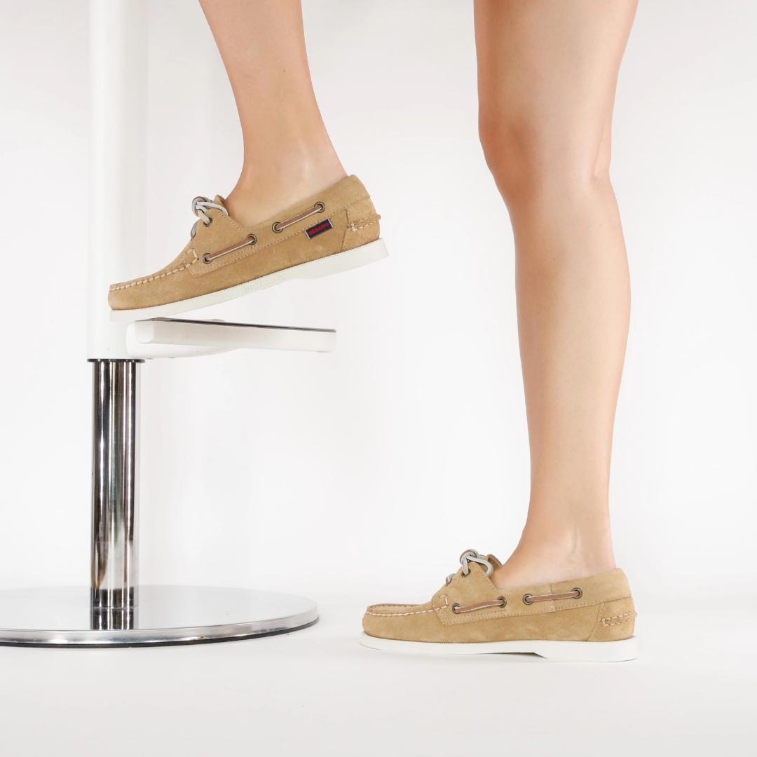 Le Sebago Portland Flesh Out sono le intramontabili scarpe da barca in camoscio beige dallo stile classico ed elegante. La chiusura tramite stringhe in cuoio su due occhielli classici e la suola liscia in gomma bianca, le rendono l’ideale non solo per una giornata in barca ma soprattutto essendo versatili, comode, leggere e fresche, possono essere abbinate a una serie di outfit, dai più casual ai più eleganti