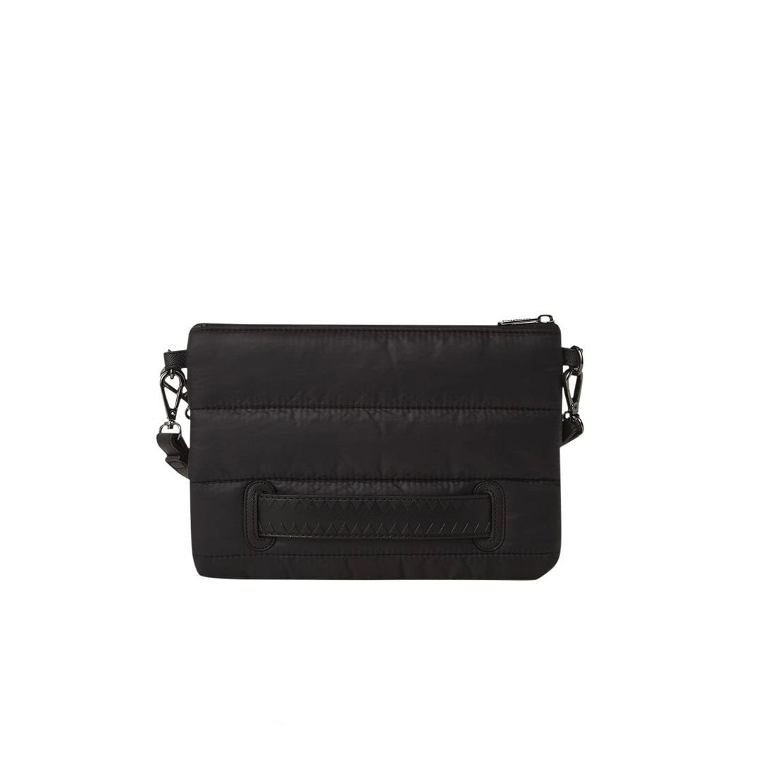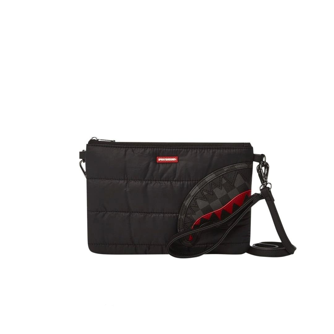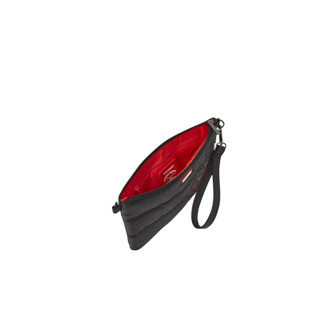 La pochette Sprayground presenta il suo iconico motivo con i denti di squalo, realizzato su tessuto imbottito nero, impermeabile. E’ utilizzabile con il cinturino da polso rimovibile, o con una comoda maniglia sul pannello frontale. All’interno è presente una tasca interna con cerniera.