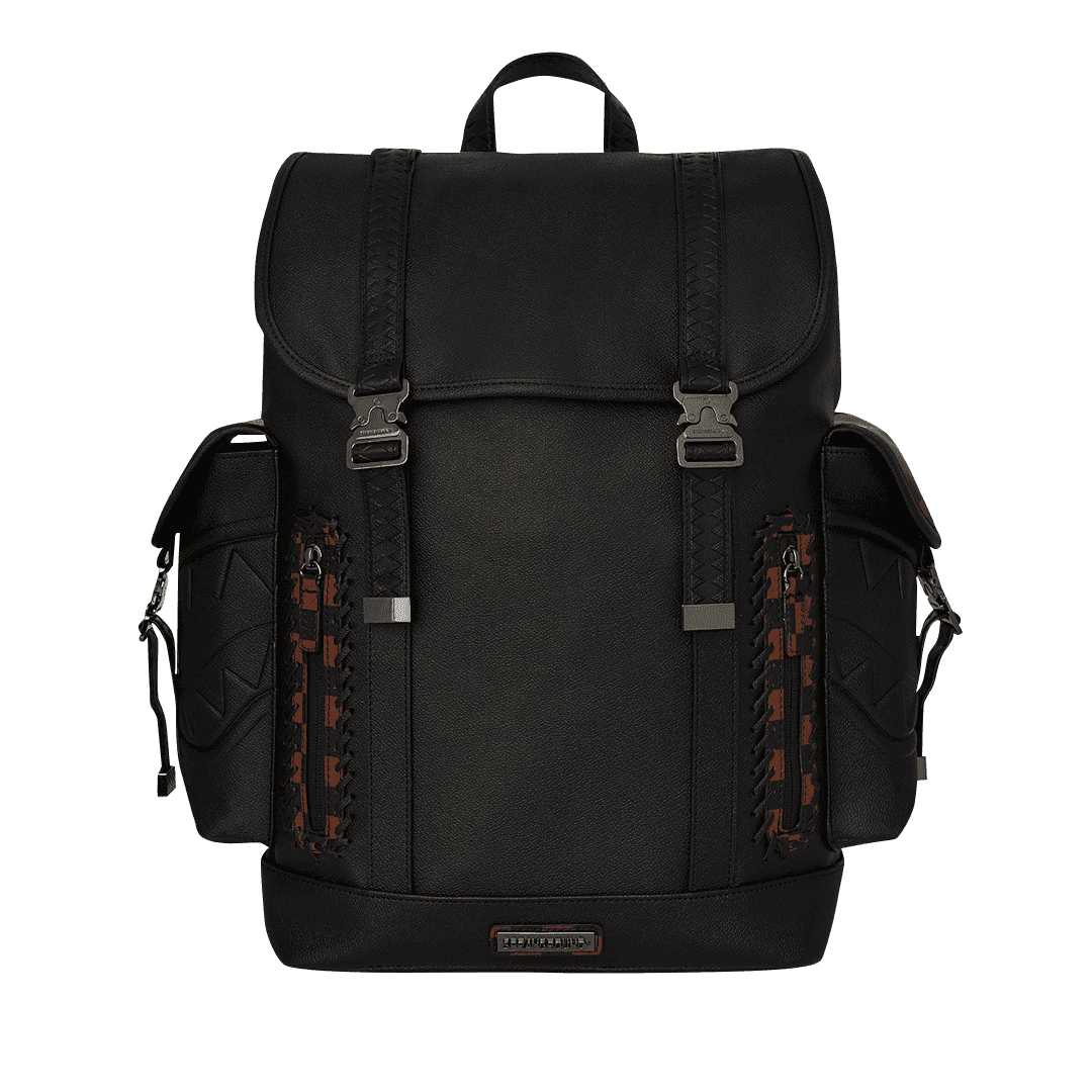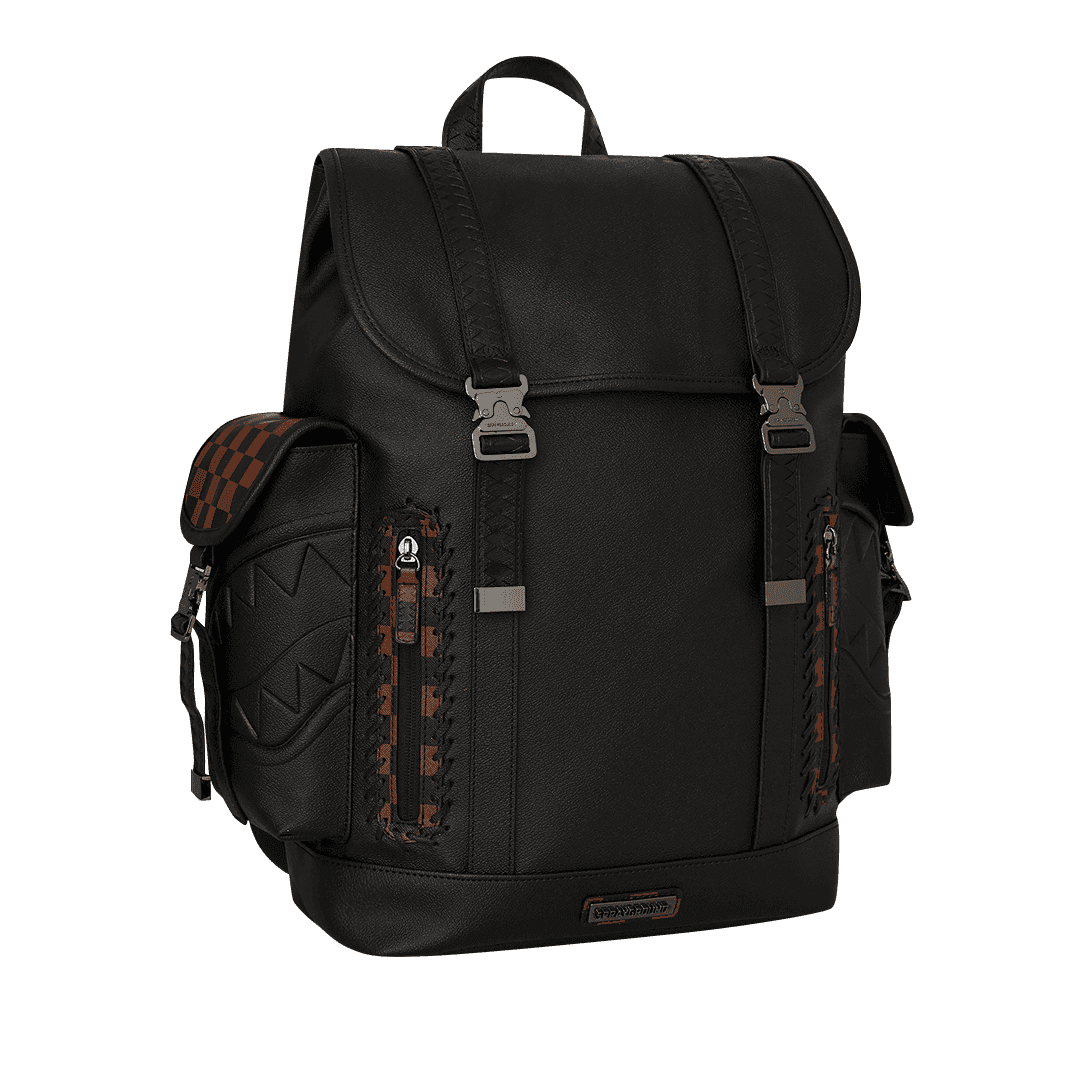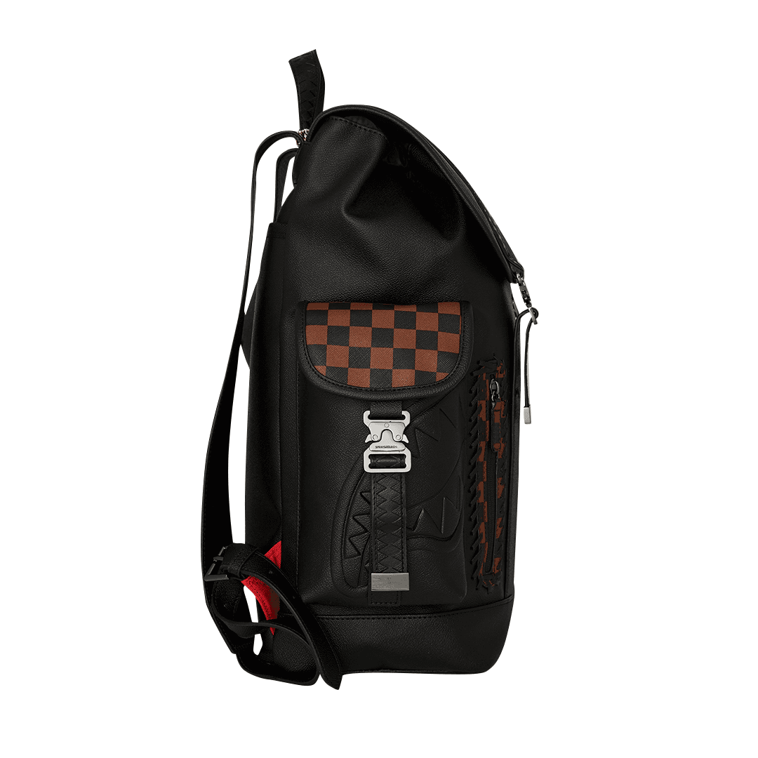 Lo zaino Sprayground è realizzato su ecopelle nera con dettagli checkerboard nero e marrone, impermeabile, con patta superiore e due tasche cargo laterali con fibbie in metallo smaltato regolabili e chiusura con coulisse. Lo scomparto principale presenta una tasca separata per laptop, mentre la parte posteriore nasconde un’imbottitura ergonomica in rete. Le cerniere e le cinghie regolabili consentono il massimo del confort.