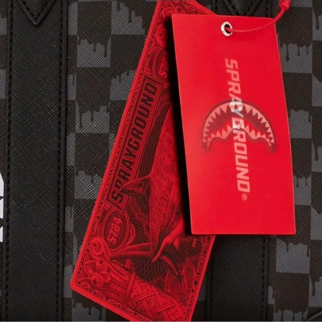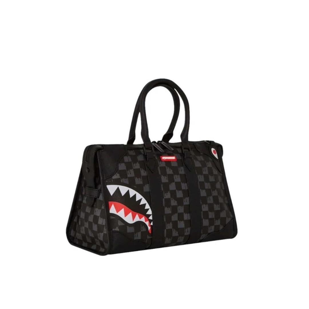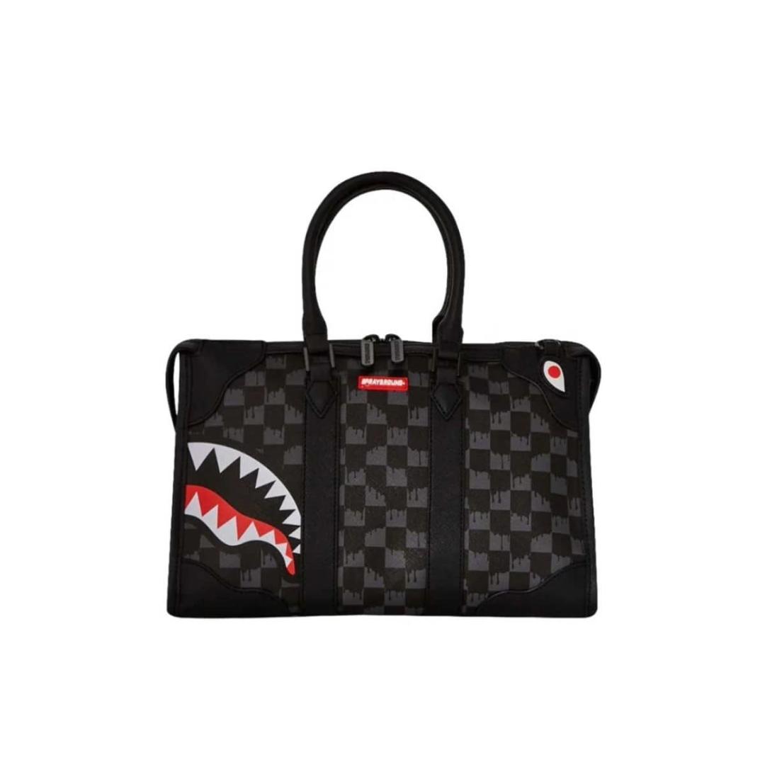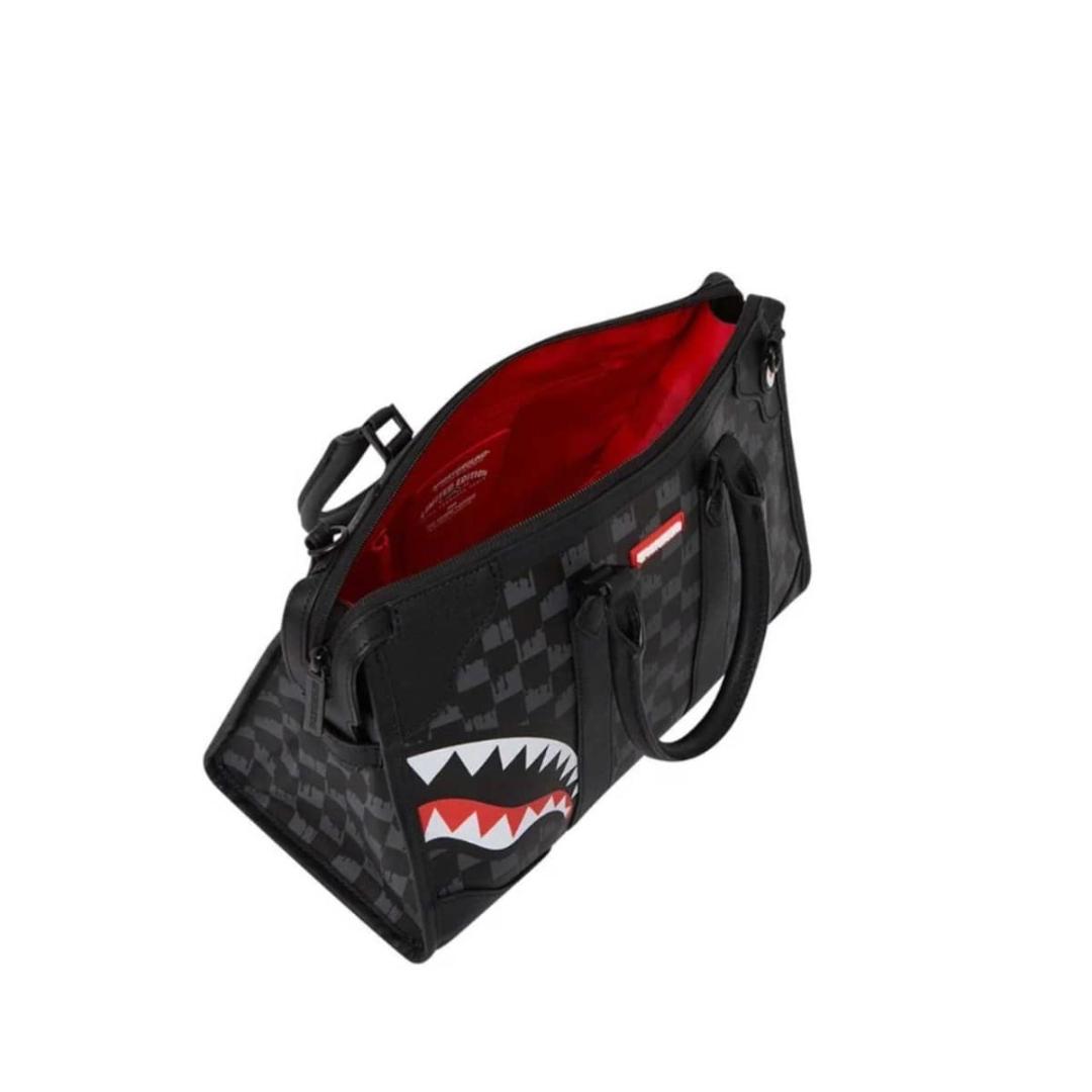 La borsa Sprayground è realizzata in ecopelle checkerboard nero e grigio e presenta il suo iconico motivo con i denti di squalo, impermeabile. La nuova forma triangolare, con due pratici manici e la possibilità di utilizzare anche la tracolla. All’interno troviamo una tasca organizer con cerniera, due tasche a bustina e una clip portachiavi.