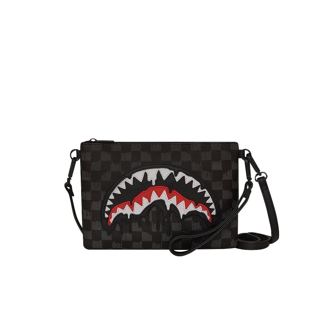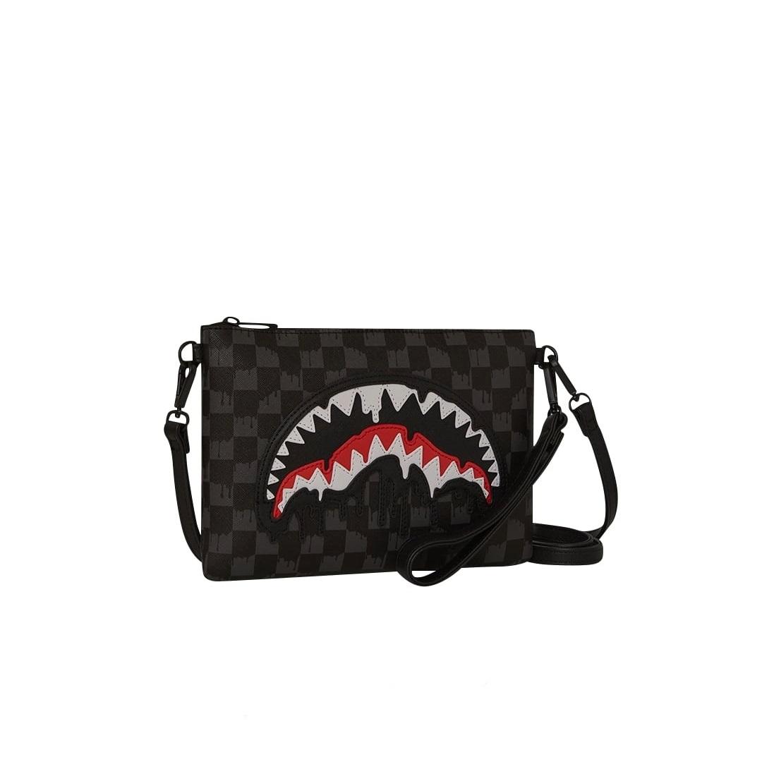 La pochette Sprayground presenta il suo iconico motivo con i denti di squalo, realizzato su ecopelle checkerboard nero e grigio impermeabile, con effetto “gocciolante”. E’ utilizzabile con il cinturino da polso rimovibile, o con una comoda maniglia sul pannello frontale. All’interno è presente una tasca interna con cerniera.