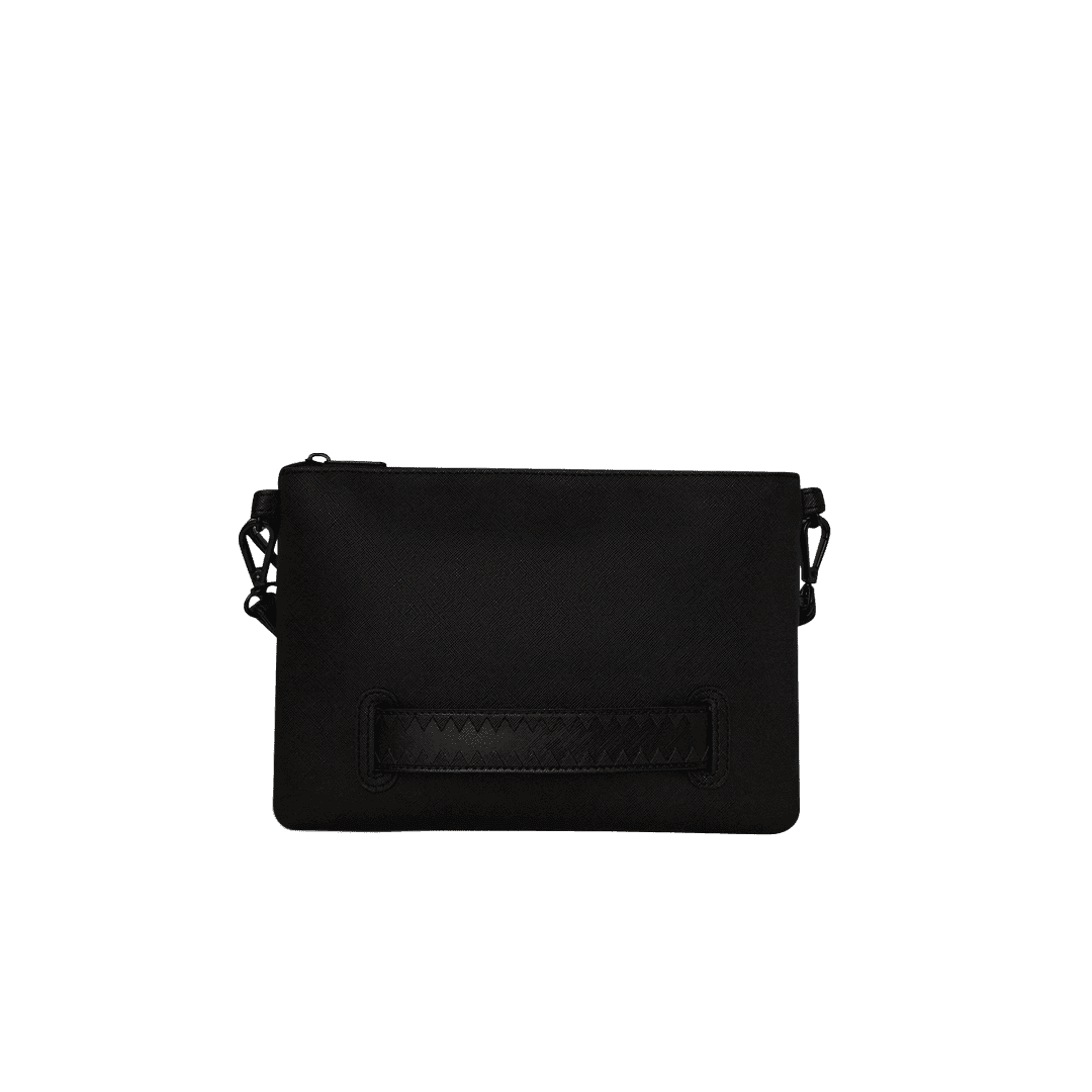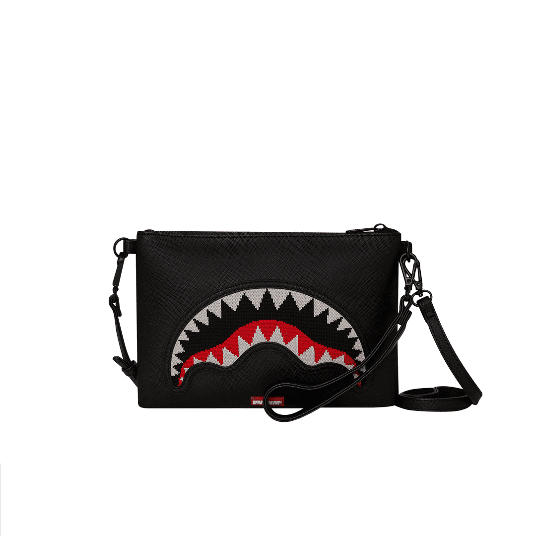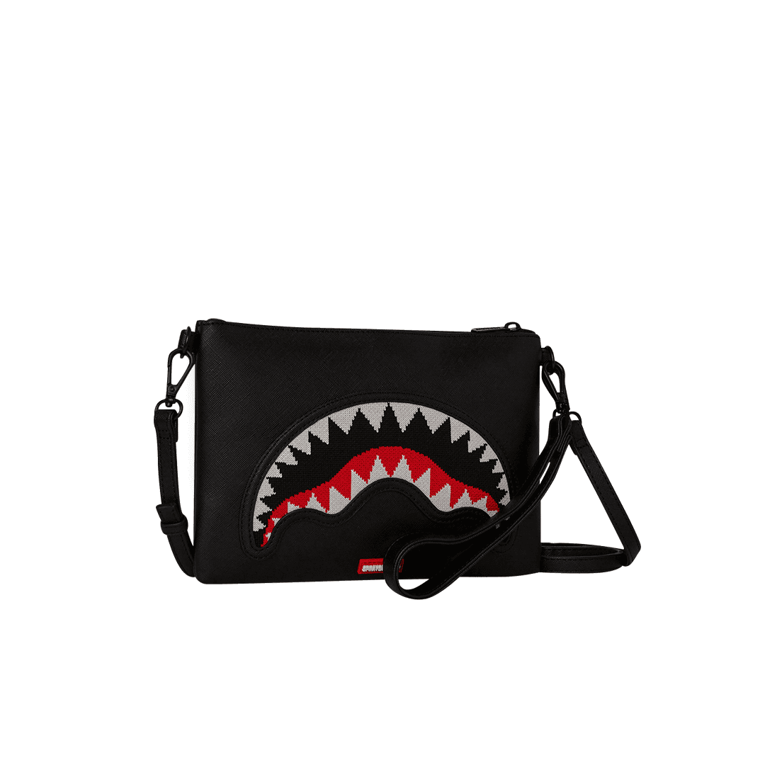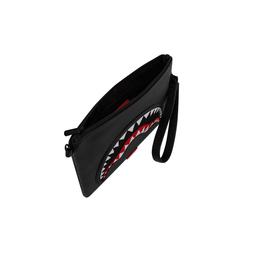 La pochette Sprayground presenta il suo iconico motivo con i denti di squalo, realizzato su ecopelle nera impermeabile. E’ utilizzabile con il cinturino da polso rimovibile, o con una comoda maniglia sul pannello frontale. All’interno è presente una tasca interna con cerniera.