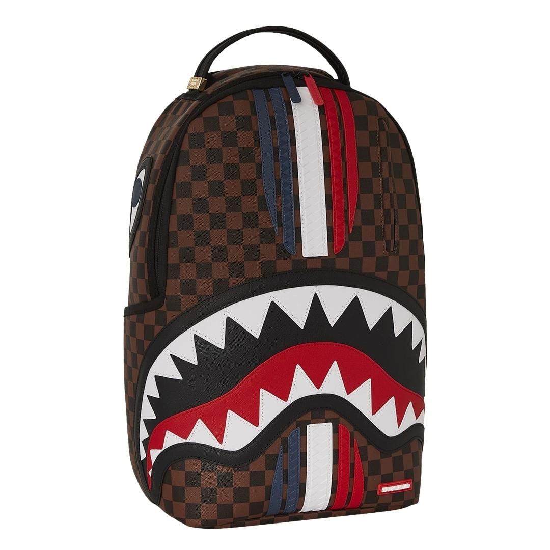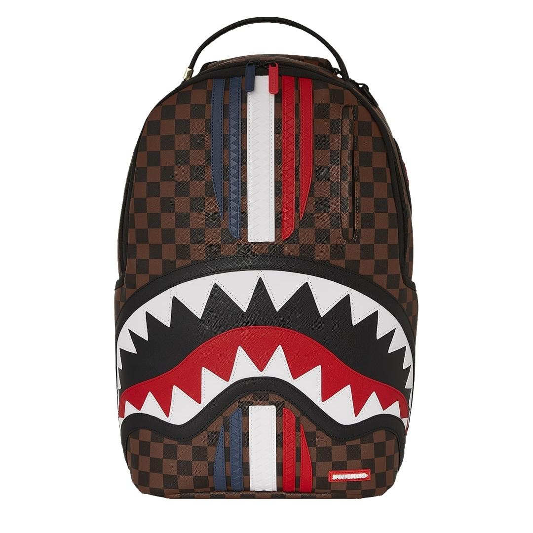 Lo zaino Sprayground presenta il suo iconico motivo con i denti di squalo su ecopelle checkerboard nero e marrone con stripes che formano la bandiera francese, impermeabile. Lo scomparto principale presenta uno tasca per laptop separato, mentre la parte posteriore nasconde un’imbottitura ergonomica in rete. Le cerniere e le cinghie regolabili permettono il massimo del confort.