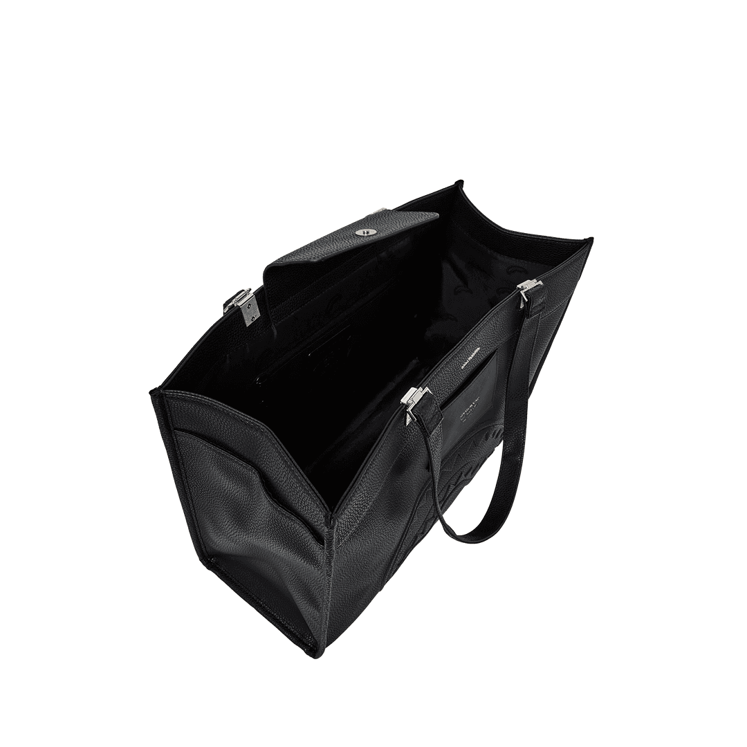 La borsa Sprayground è realizzata in ecopelle nera impermeabile, con un design inconfondibile che richiama al mondo streetwear. Le dimensioni generose, con due pratici manici e chiusura con clip magnetica, garantiscono ampio spazio per trasportare tutto ciò che serve nella quotidianità. All’interno troviamo una tasca organizer con cerniera, due tasche a bustina e una clip portachiavi.