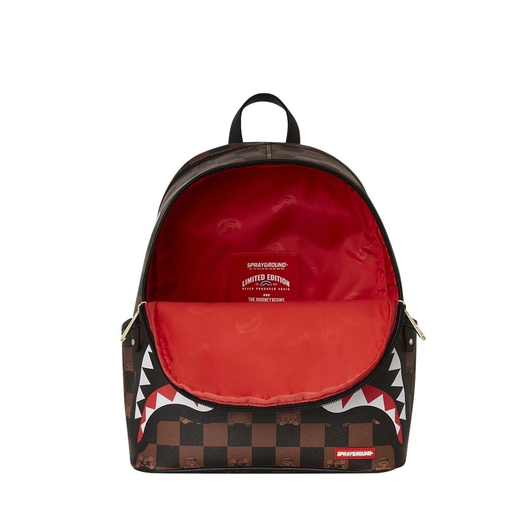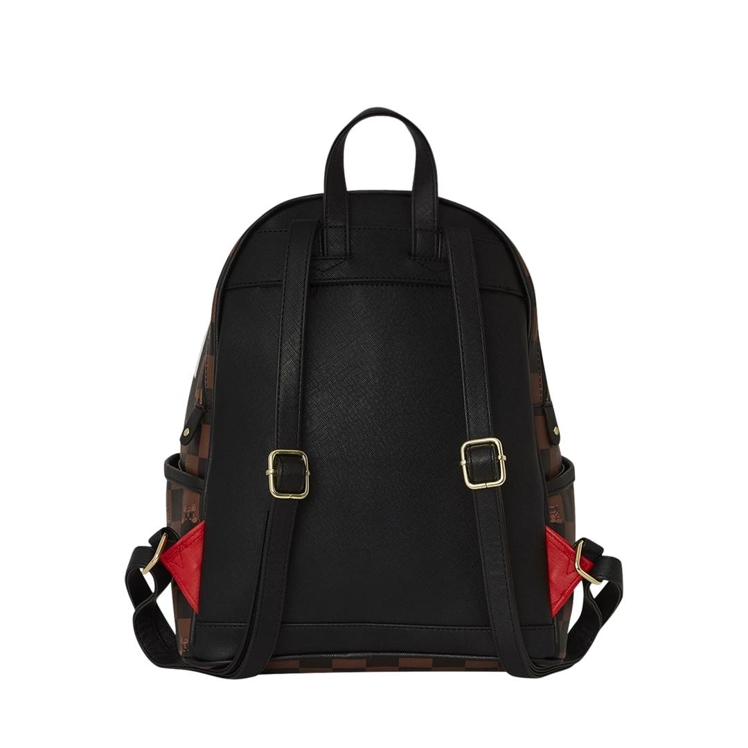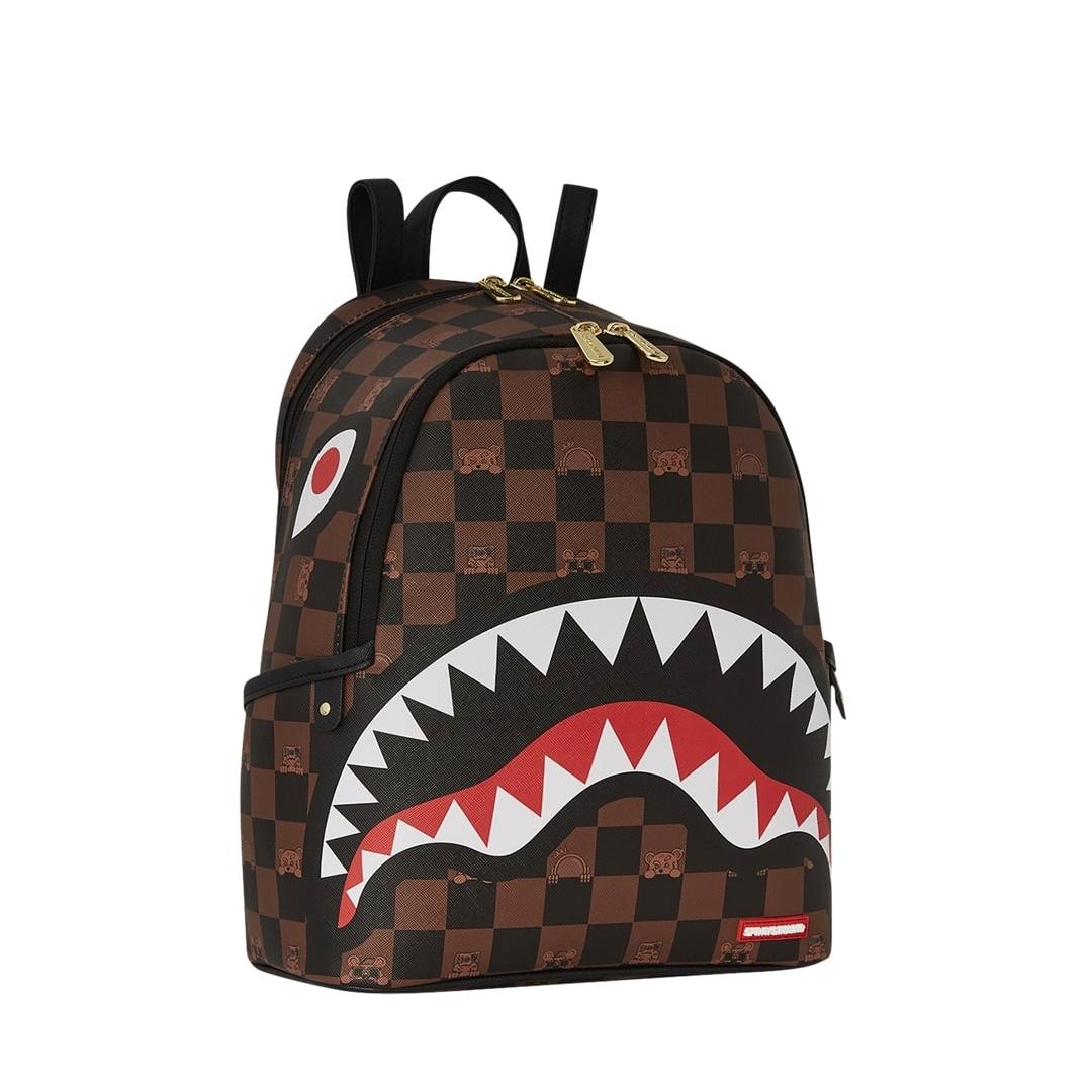 Lo zainetto Sprayground presenta il suo iconico motivo con i denti di squalo, realizzato su ecopelle checkerboard marrone e nero con piccoli disegni tra gli scacchi, impermeabile. E’ composto da due scomparti principali con zip, tasche laterali e una tasca nascosta. All’interno troviamo una tasca organizer con cerniera, due tasche a bustina e una clip portachiavi Le cinghie regolabili permettono di adattare lo zainetto, assicurando un comfort unico.