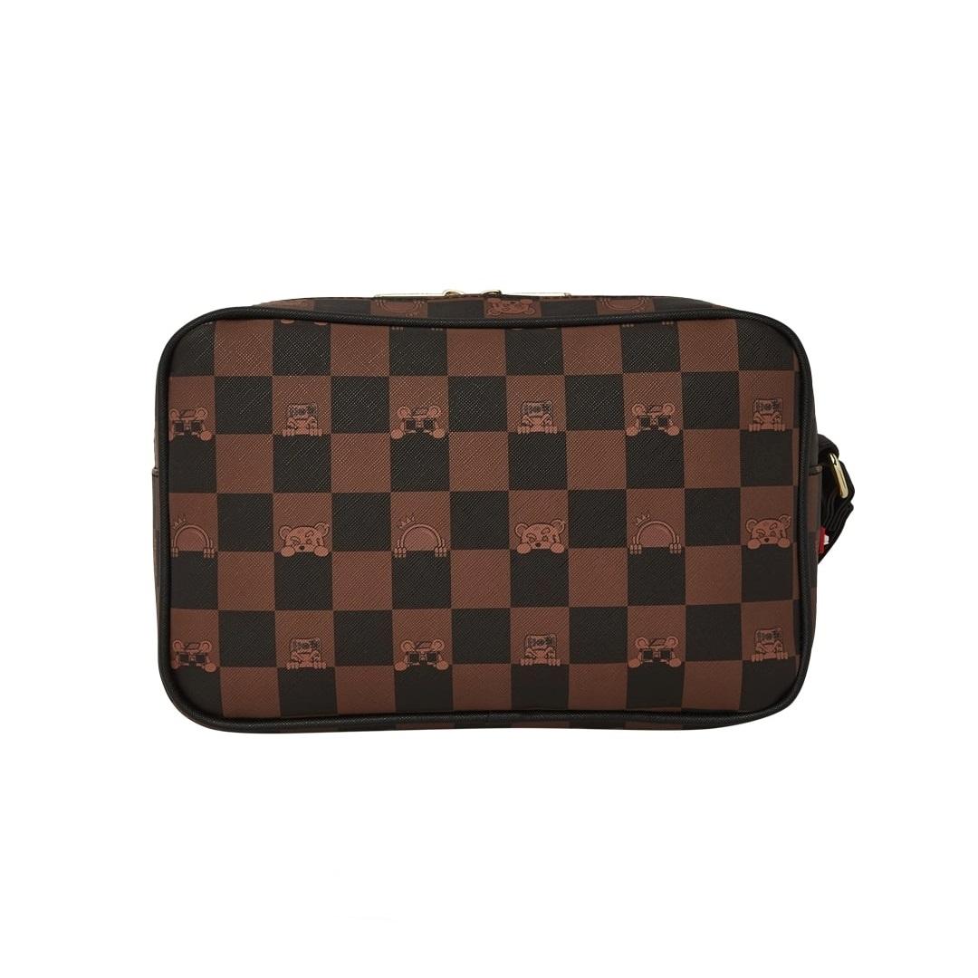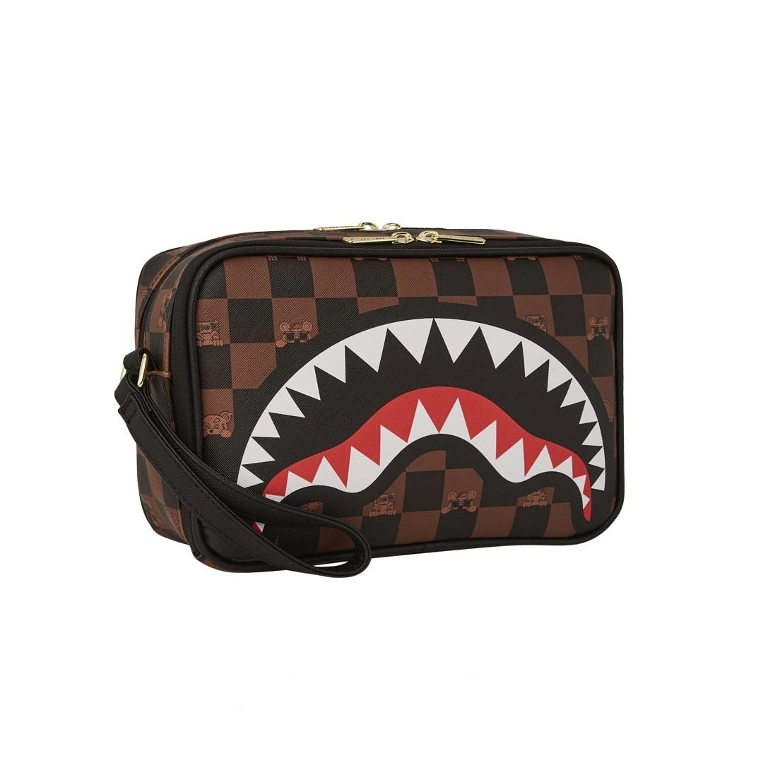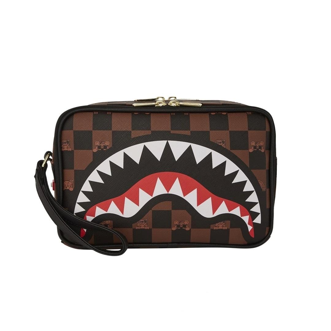 La toiletry Sprayground presenta il suo iconico motivo con i denti di squalo, realizzato su ecopelle checkerboard nero e marrone con piccoli disegni tra gli scacchi, impermeabile. E’ utilizzabile con il cinturino ed è l’ideale per portare gli effetti personali con una comoda maniglia sul pannello frontale. E’ composta da due tasche con cerniera.