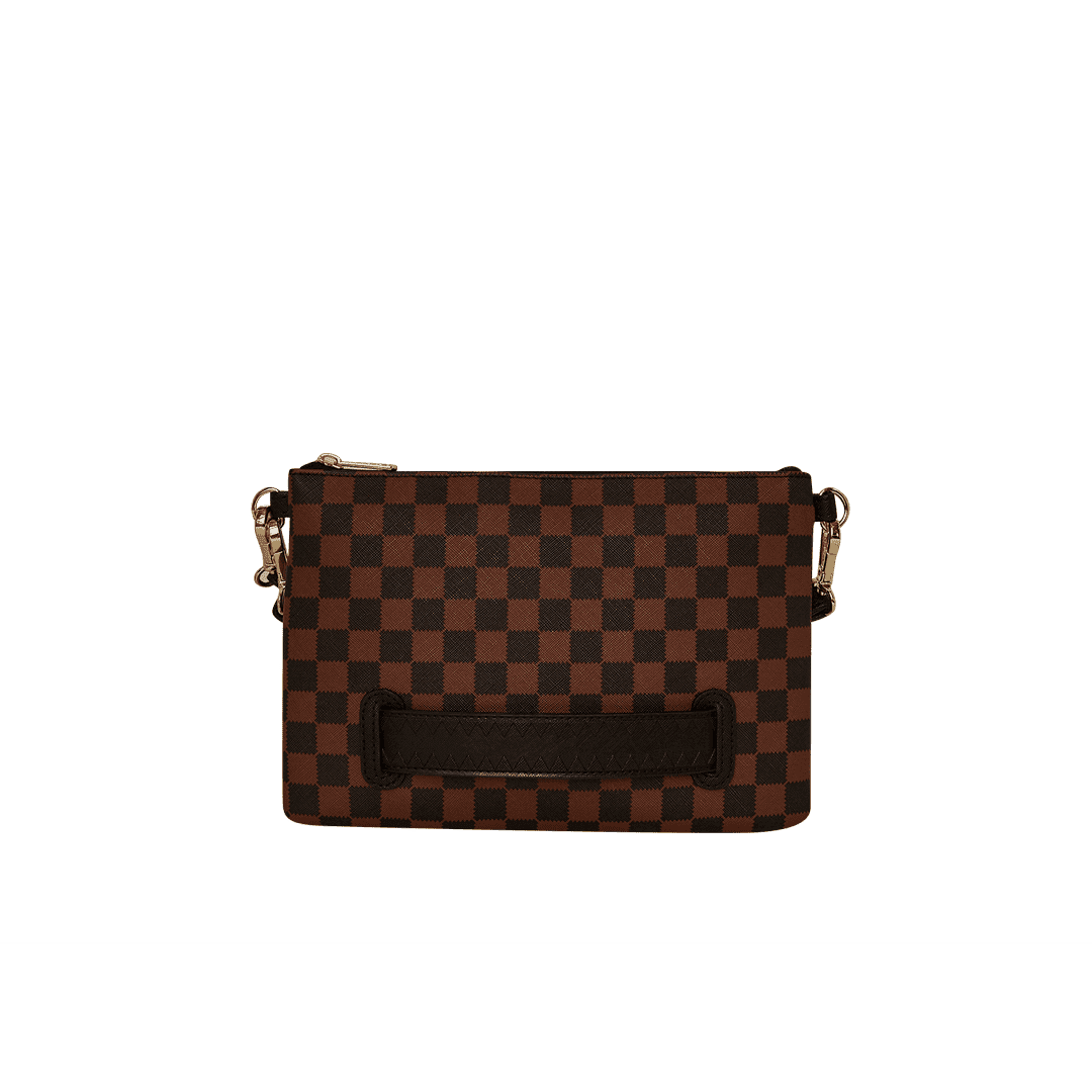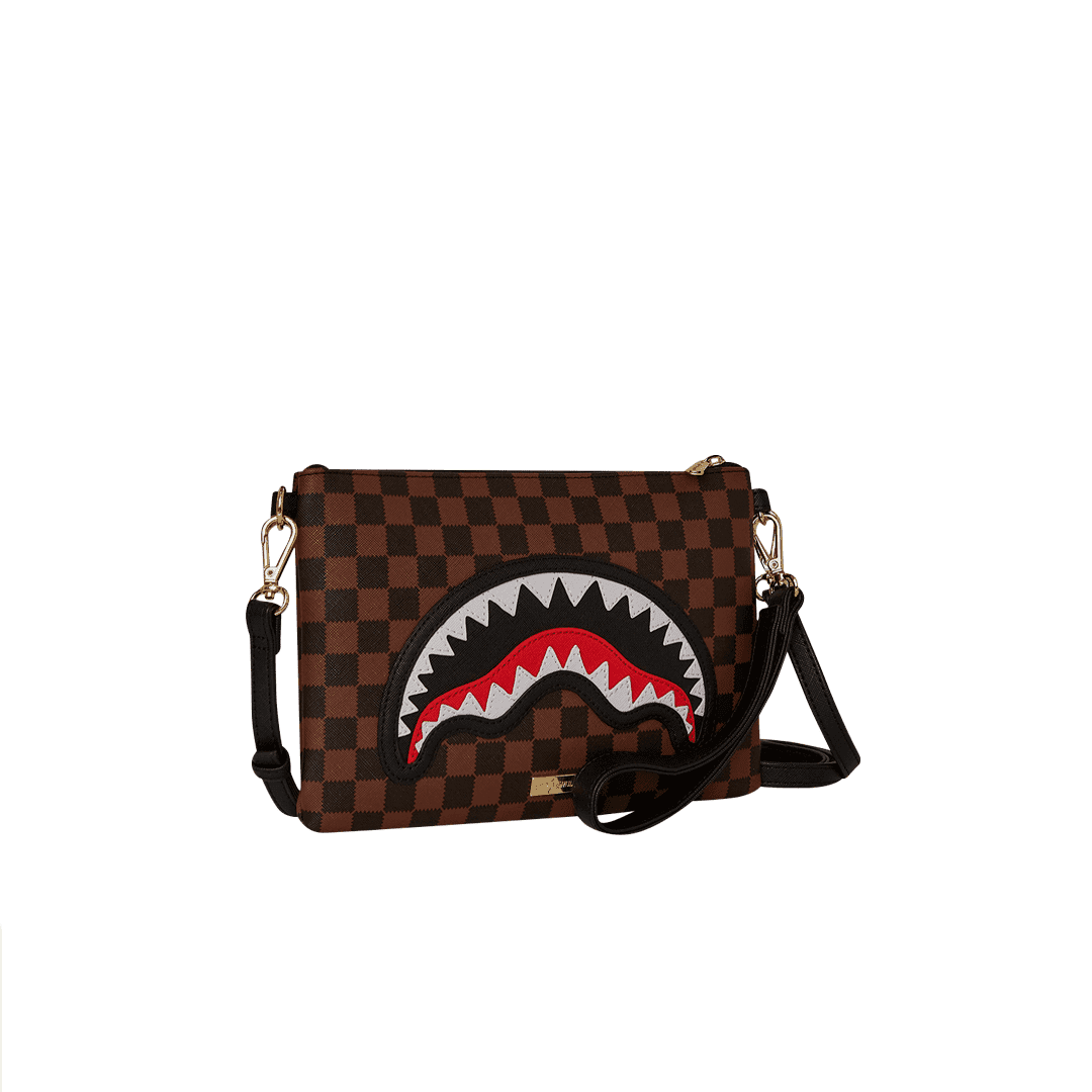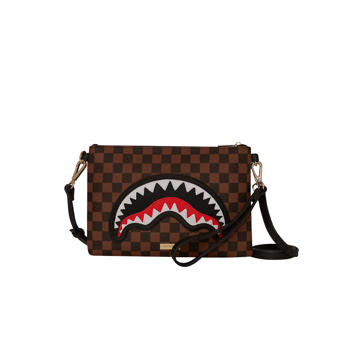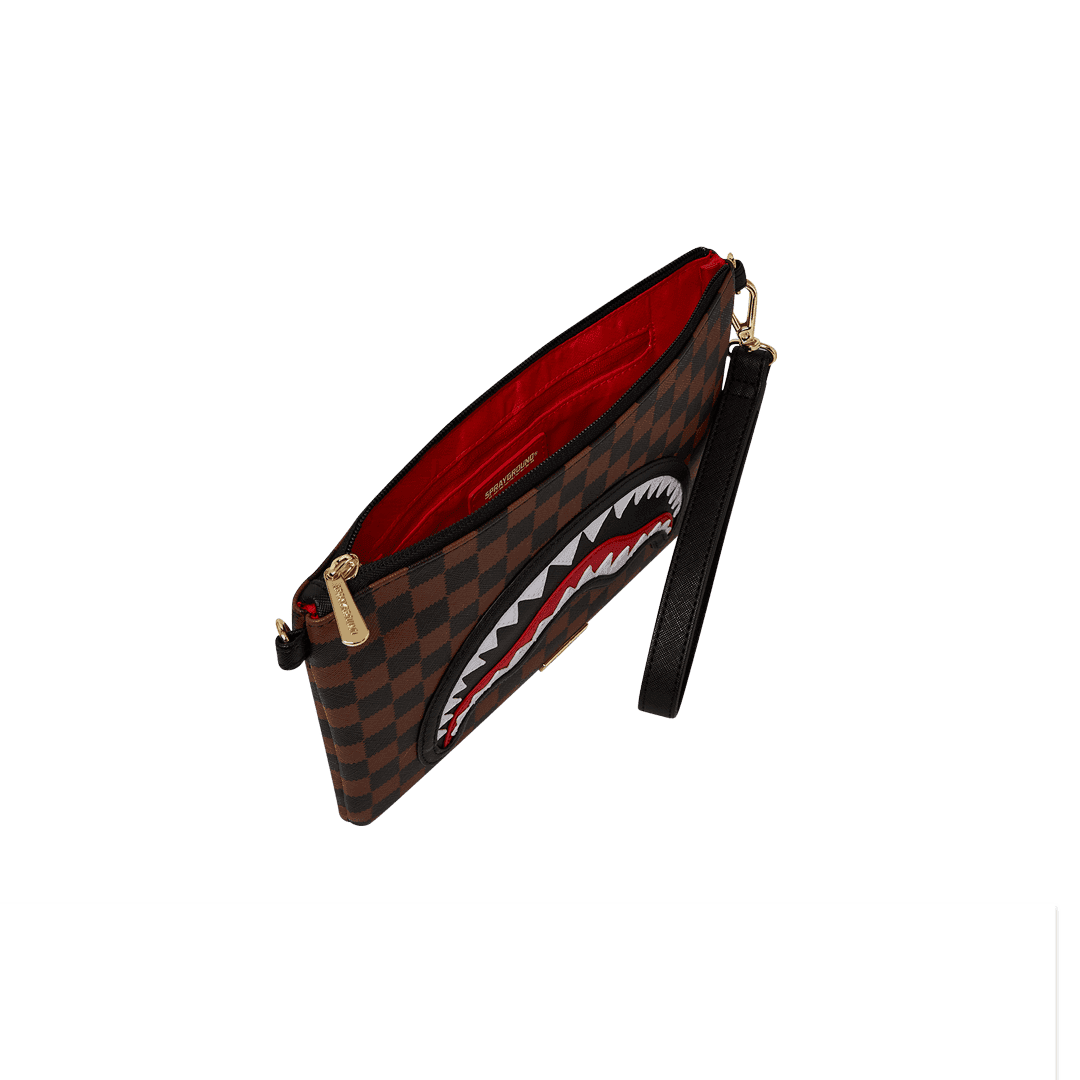 La pochette Sprayground presenta il suo iconico motivo con i denti di squalo, realizzato su ecopelle checkerboard nero e marrone impermeabile. E’ utilizzabile con il cinturino da polso rimovibile, o con una comoda maniglia sul pannello frontale. All’interno è presente una tasca interna con cerniera.