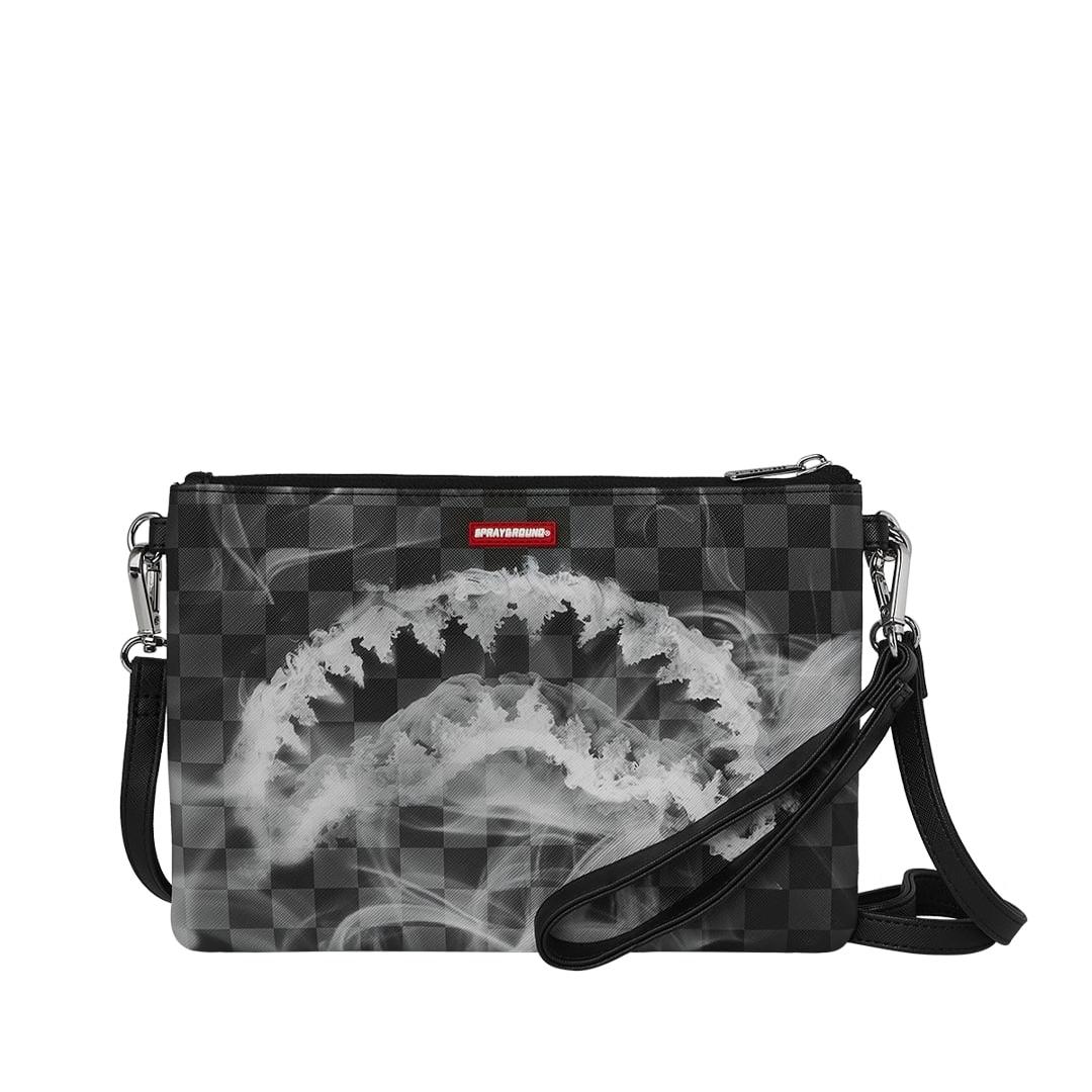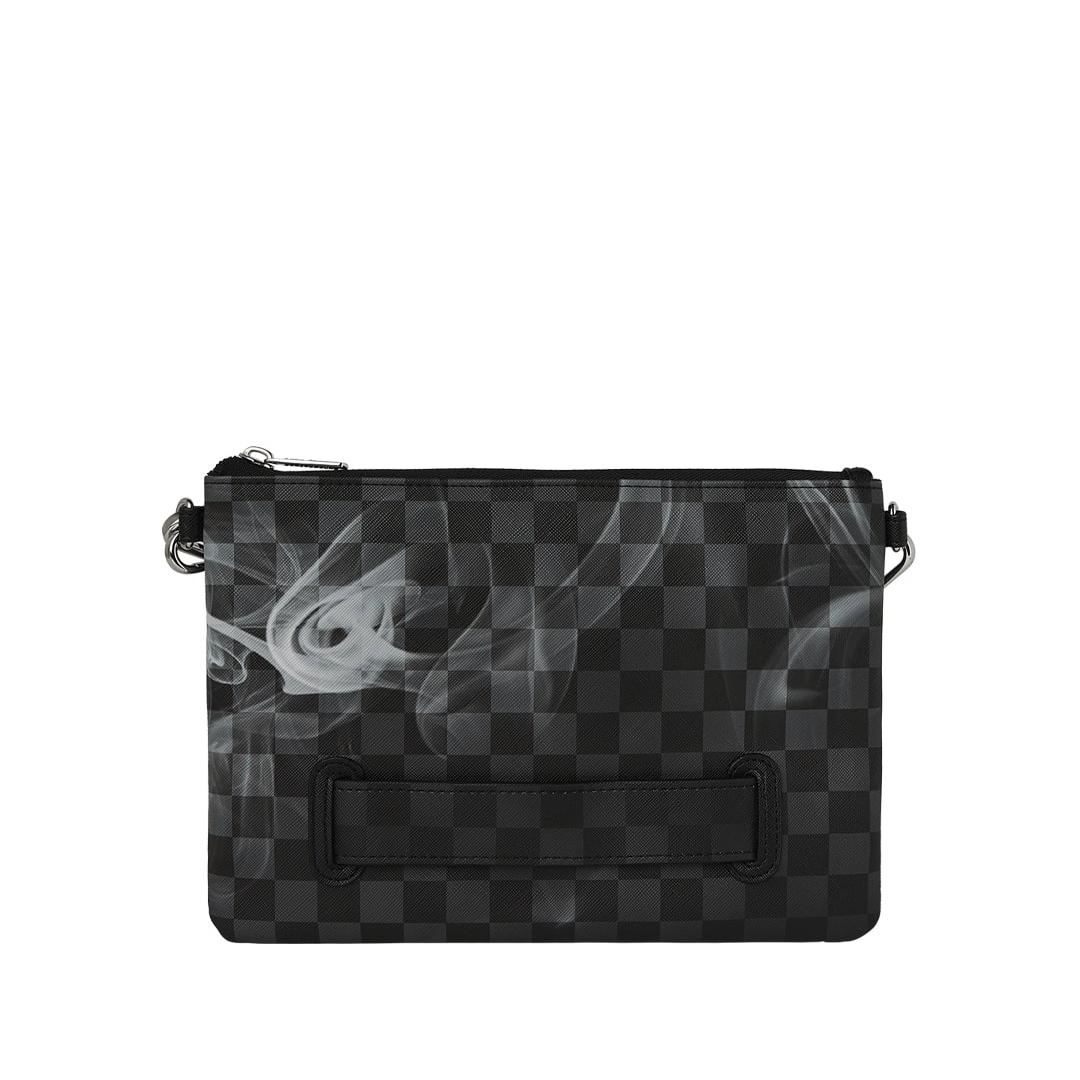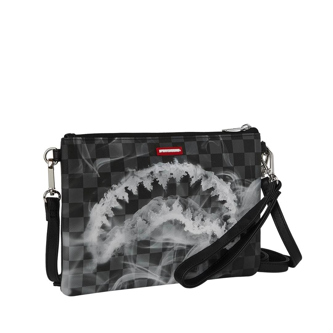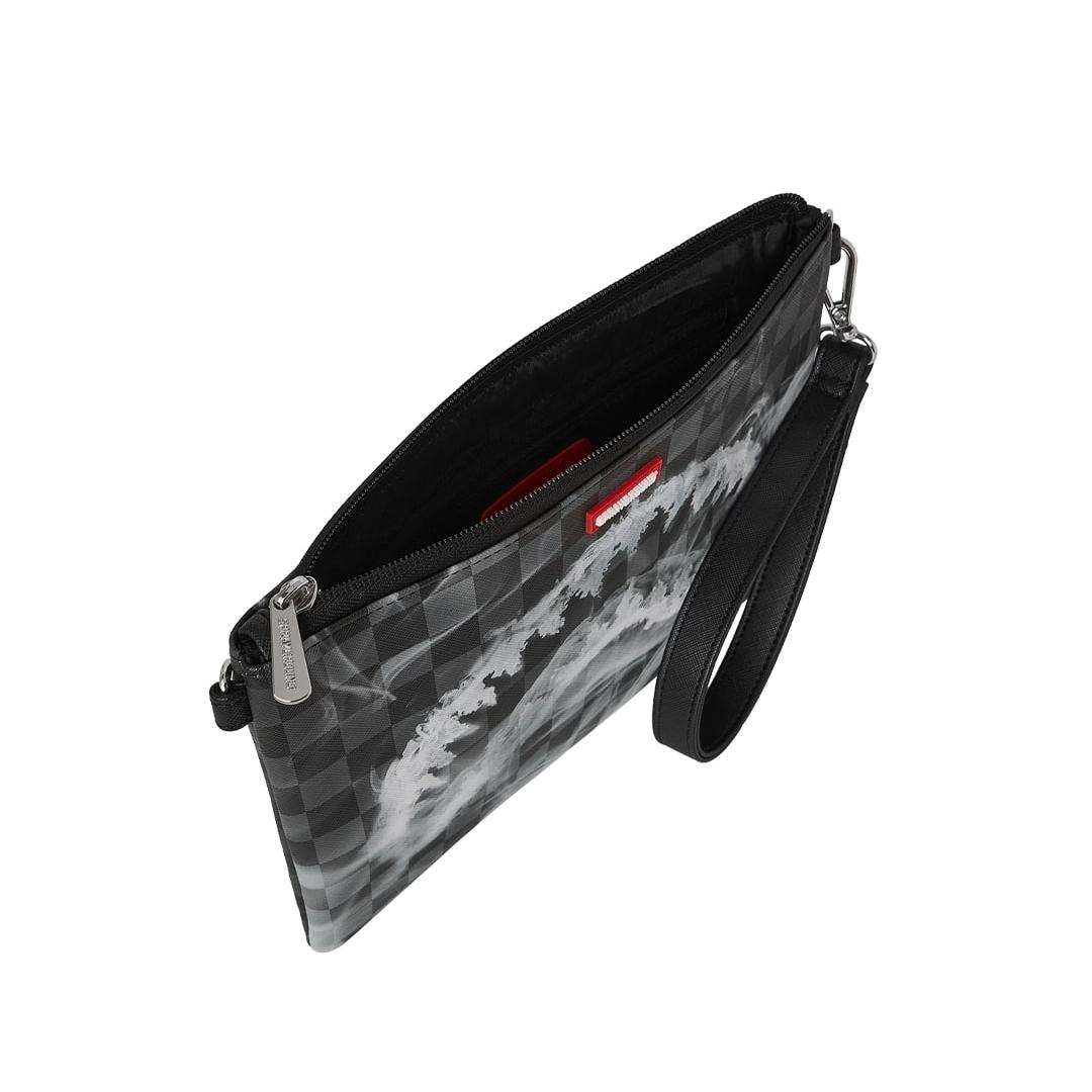 La pochette Sprayground presenta il suo iconico motivo con i denti di squalo, realizzato su ecopelle checkerboard nero e grigio impermeabile. E’ utilizzabile con il cinturino da polso rimovibile, o con una comoda maniglia sul pannello frontale. All’interno è presente una tasca interna con cerniera.