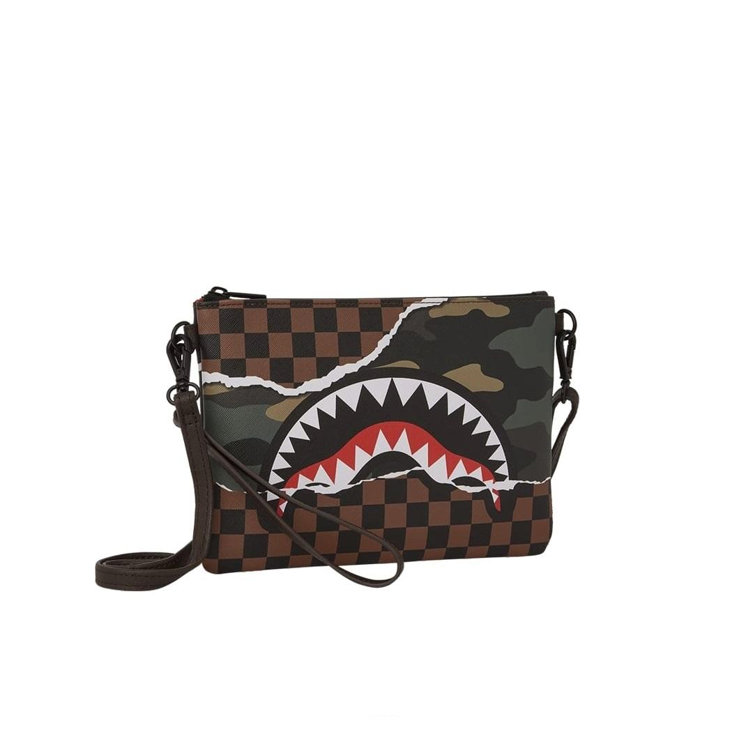 La pochette Sprayground presenta il suo iconico motivo con i denti di squalo, realizzato su ecopelle checkerboard nero e marrone, impermeabile. E’ utilizzabile con il cinturino da polso rimovibile, o con una comoda maniglia sul pannello frontale. All’interno è presente una tasca interna con cerniera.