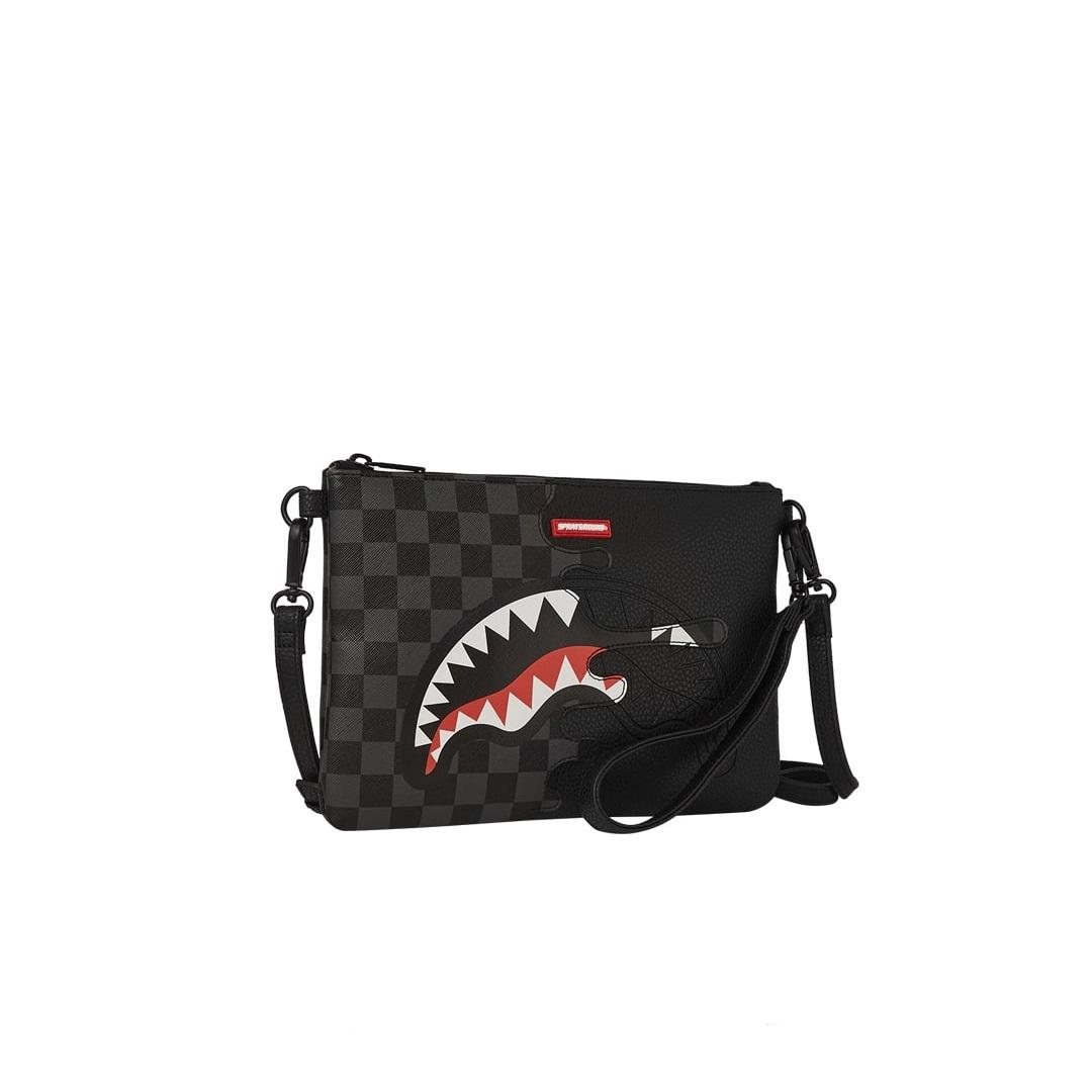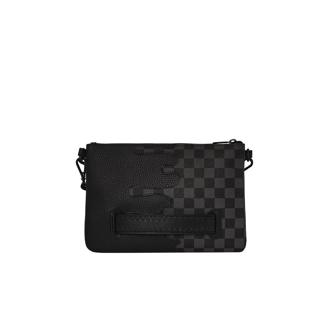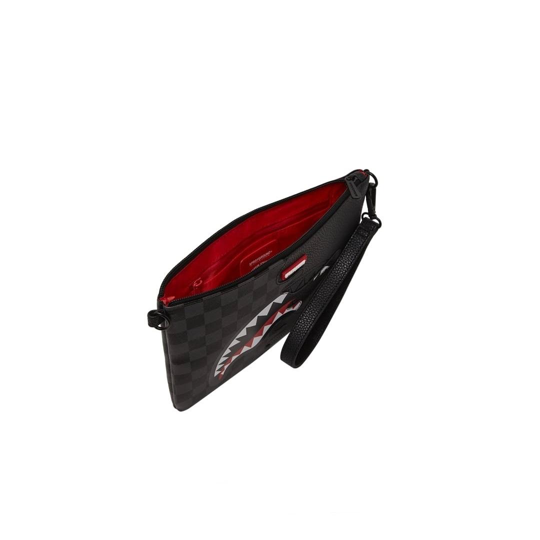 La pochette Sprayground presenta il suo iconico motivo con i denti di squalo, realizzato su ecopelle checkerboard nero e grigio sovrapposto con l’effetto colata nero, impermeabile. E’ utilizzabile con il cinturino da polso rimovibile, o con una comoda maniglia sul pannello frontale. All’interno è presente una tasca interna con cerniera.