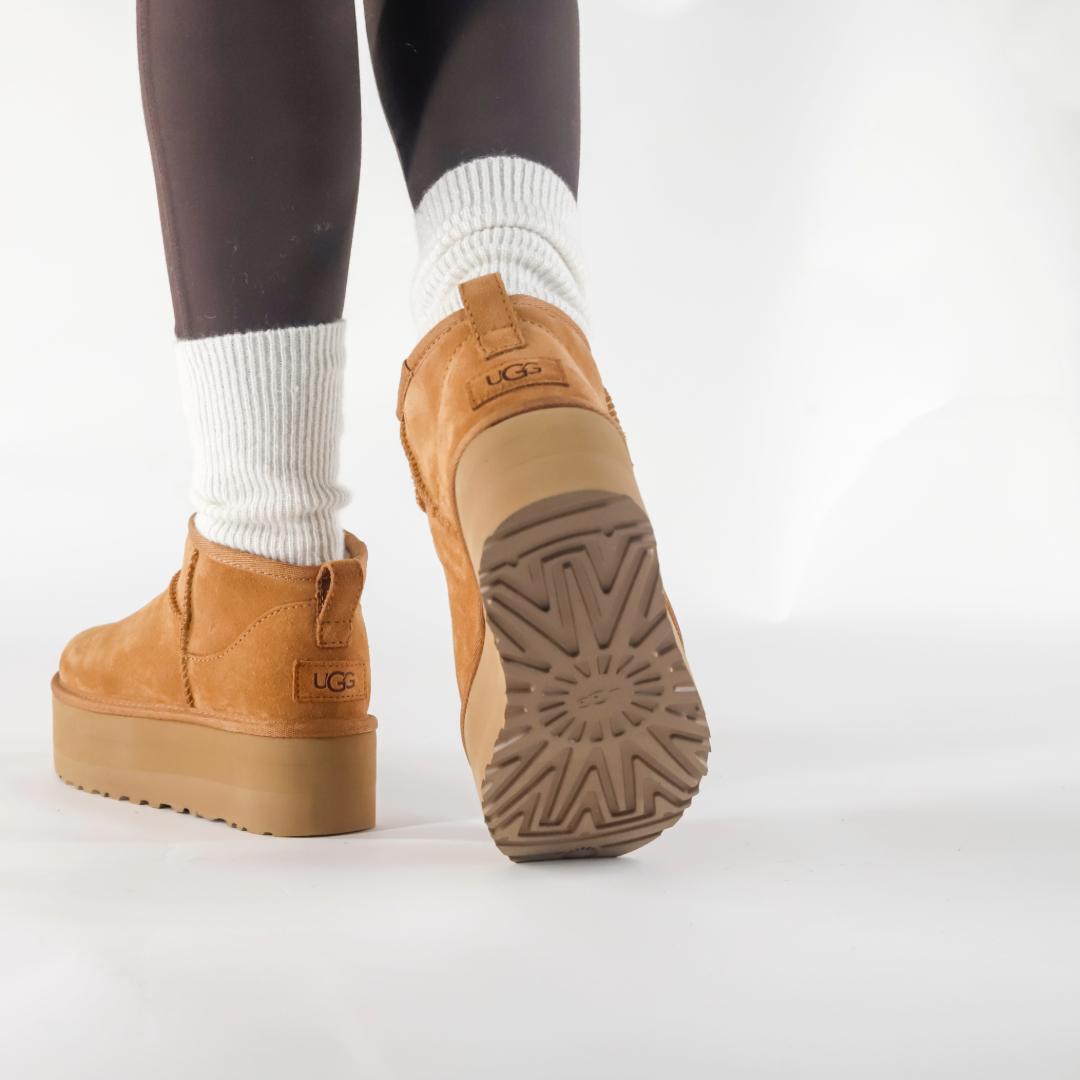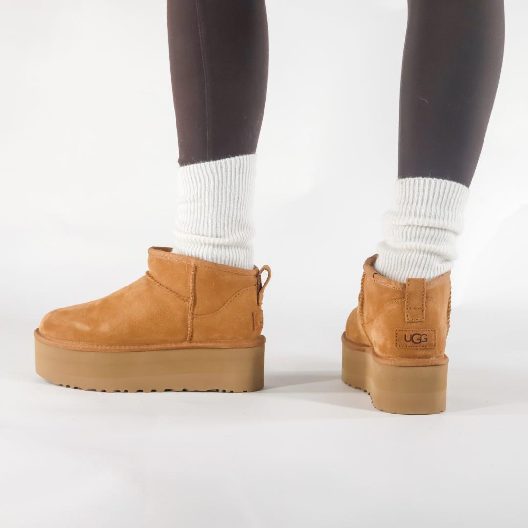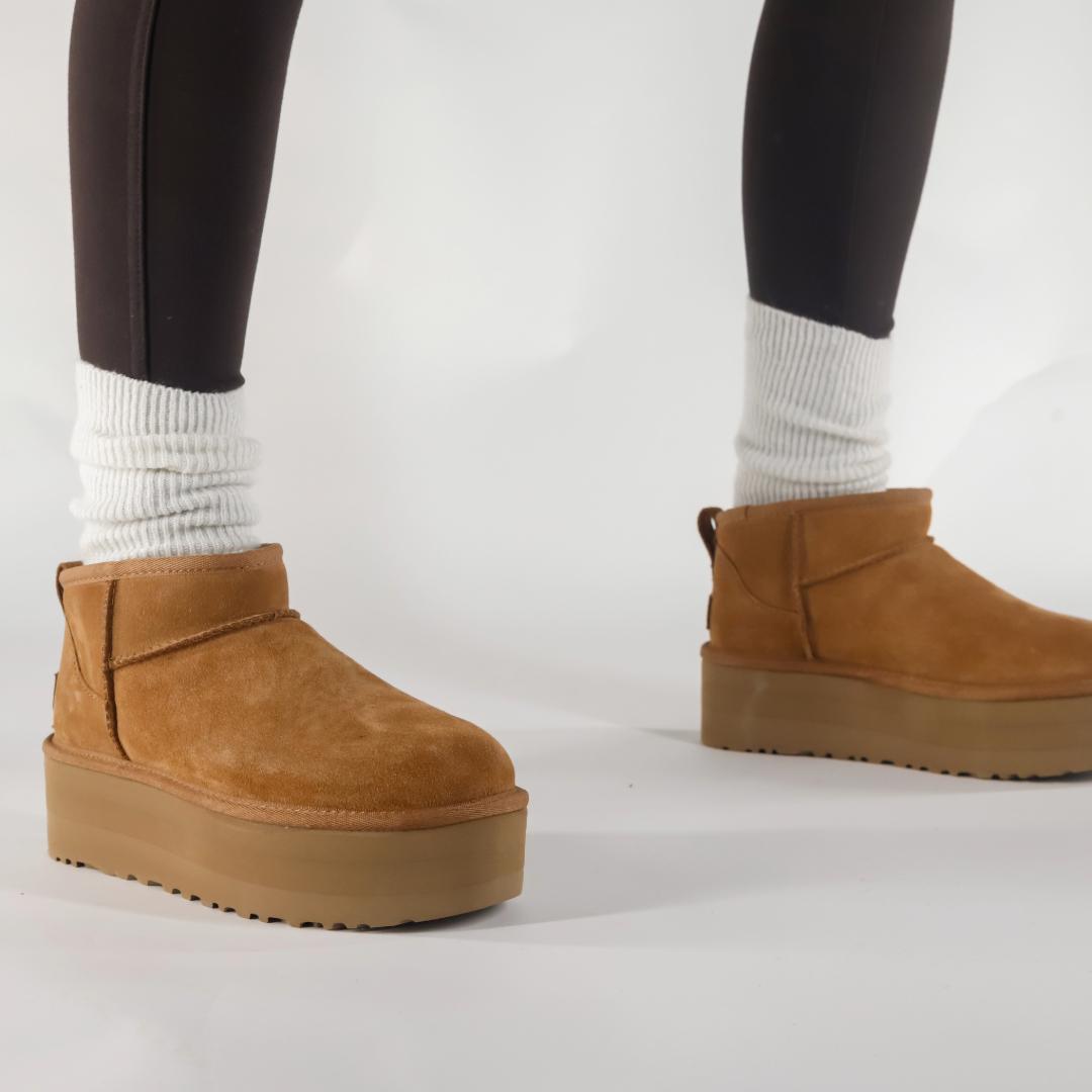 Gli UGG Classic Ultra Mini Platform sono la versione più moderna di un grande classico della collezione Ugg e un vero e proprio must have. È uno dei modelli con più carattere e di punta del brand. Le sue linee minimal e la silhouette estrapolata dal mondo sportivo ma rielaborata con nuovi trattamenti lo rendono lo stivaletto perfetto per tutte le stagioni e per tutti i tipi di look. La tomaia è realizzata in soffice pelle scamosciata color nocciola con interni in montone e un platform di 5 cm.