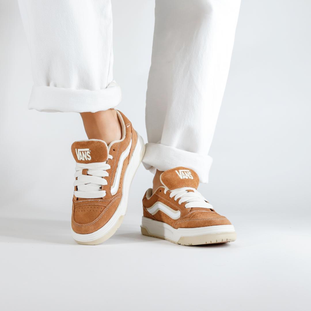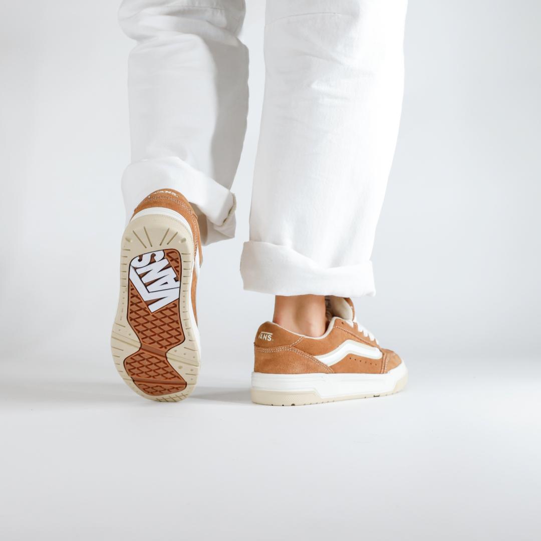 Le VANS Hylane prendono ispirazione dai modelli da skateboard rivisitando la storica Upland del 1999. Sono realizzate in camoscio marrone con l’inconfondibile banda laterale lucida in 3D e i loghi ricamati, la linguetta è voluminosa per dare un tocco rétro al design. La suola reverse waffle con logo Vans è oversize e con scanalature flessibili.